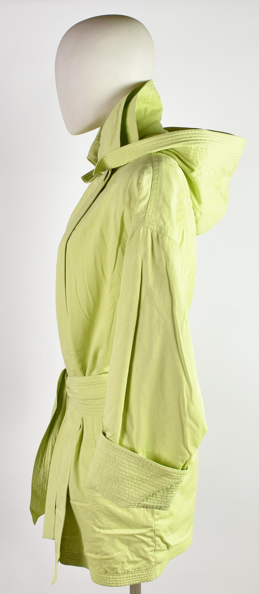 Women's green raincoat-style outerwear. Removable hood and waist belt. Collection 1989/90. 100% cotton. Size not indicated. Made in Italy. Small stains and color fading. Well preserved.