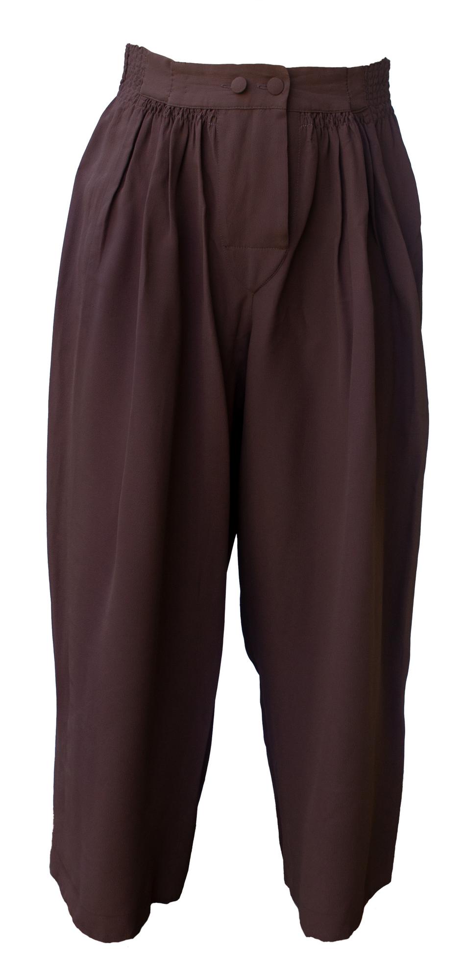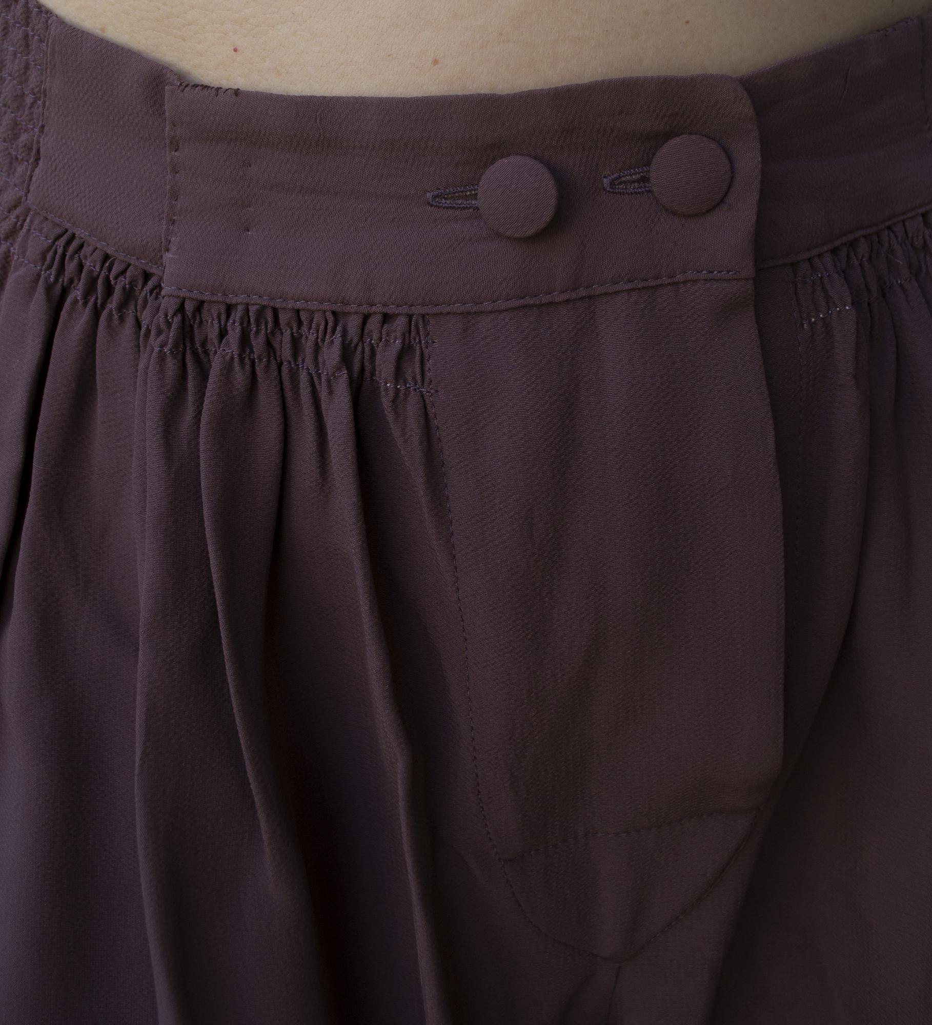 Mauve crepe marocain for this wide legs trouser. Waist embroiderd embossed and opening with two buttons. Made in Italy. Mid 80s. Size IT 42. Well Preserved.