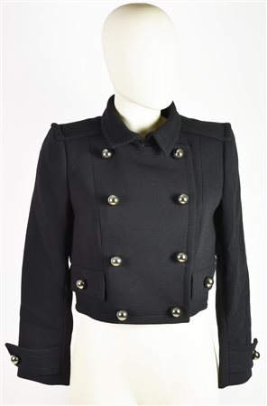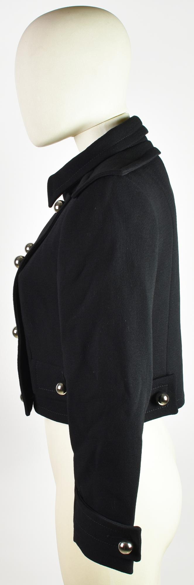 DESCRIPTION: Short black military-style jacket. Large spherical metal buttons. Early 2000s, designer Riccardo Tisci. 100% wool. Size 40. Made in France. Never worn, still with tag. Excellent condition.