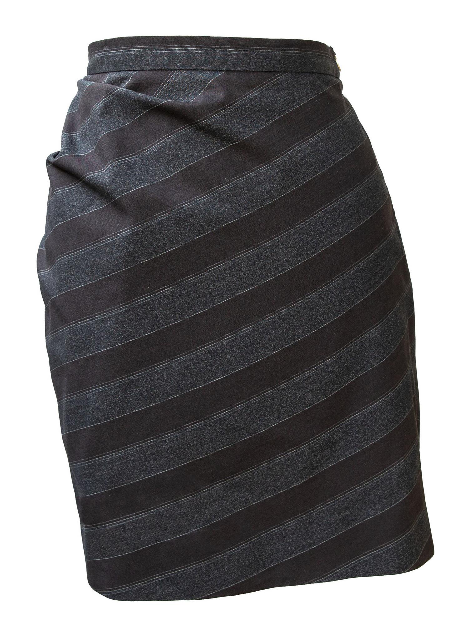 Gonna in crepe con fodera in tessuto lana gessata. Particolare costruzione con effetto 'panier' sul retro. Prodotto in Italia nei primi anni '90. Taglia IT 42. Perfettamente conservata.