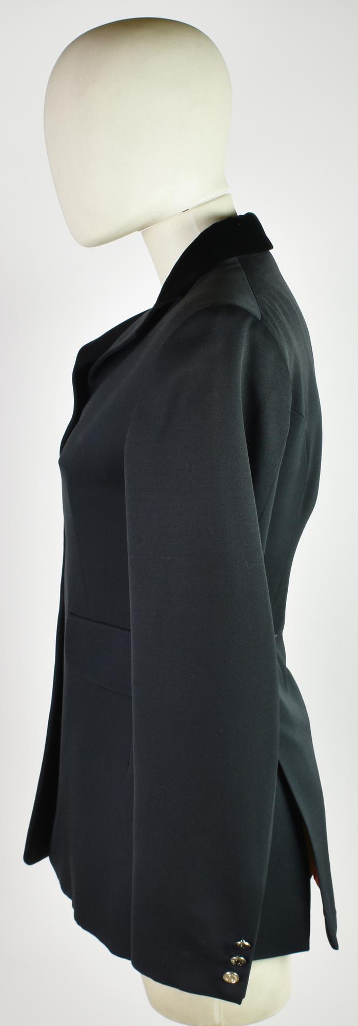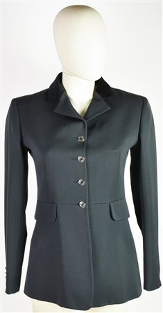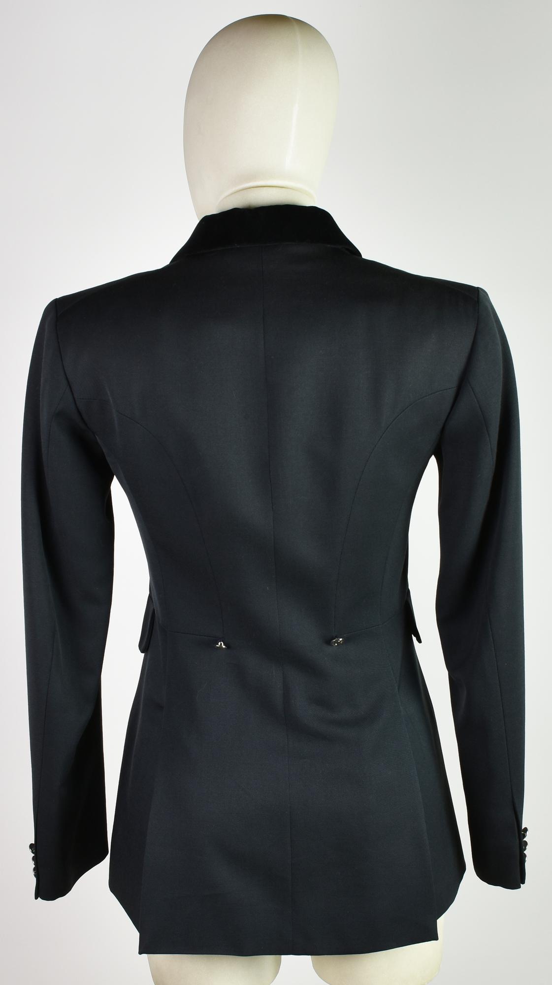 Giacca stile cavallerizza con bottoni cromati e colletto in velluto. Due tasche decorative. Chiusura a quattro bottoni. Taglia 38 FR. Prodotto in Francia. Eccellente.