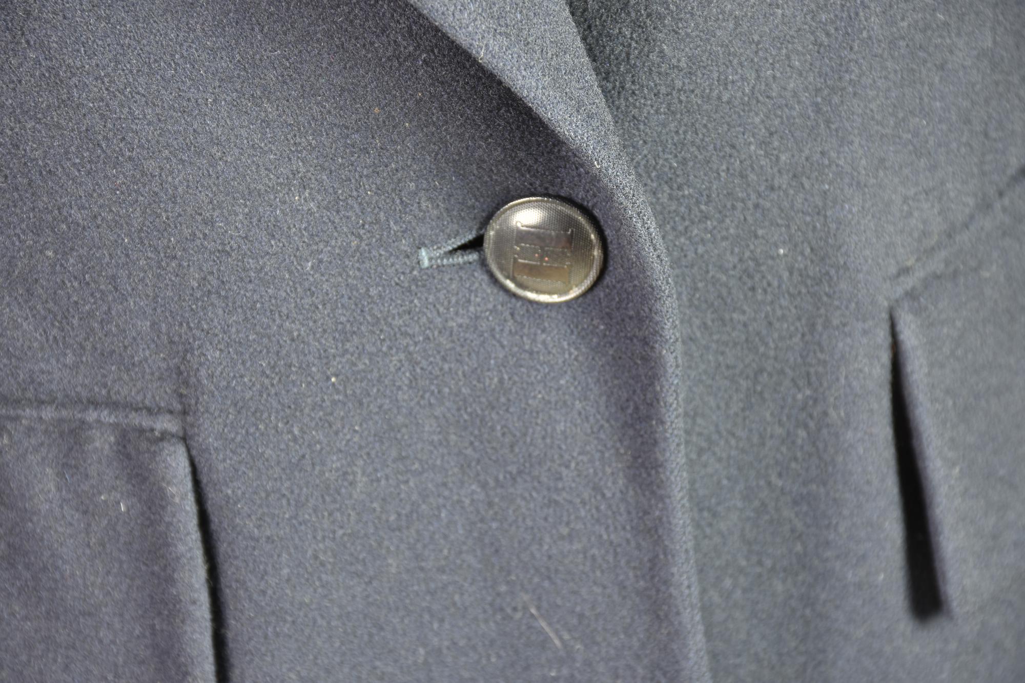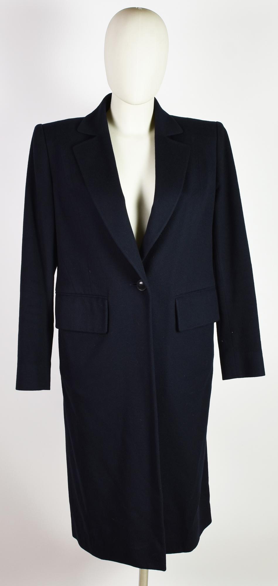 Single-button dark blue cashmere coat. Features two front pockets and padded shoulders. 100% cashmere. Size 40 FR. Made in France. Perfectly preserved.