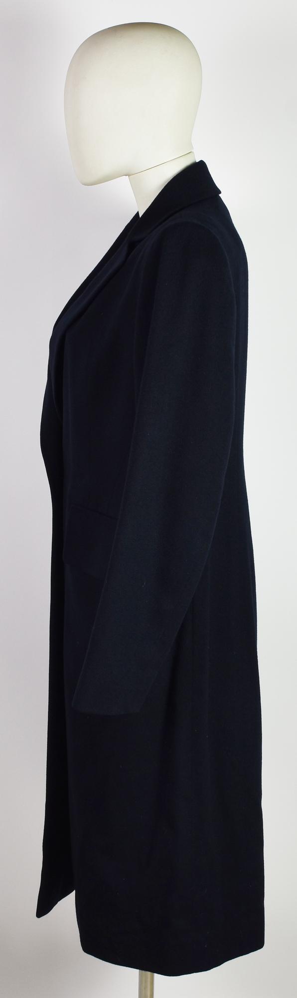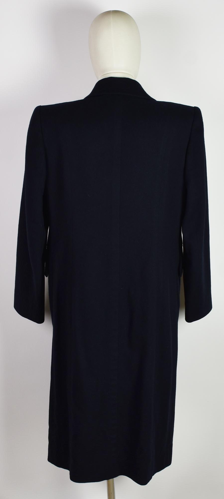 Cappotto monobottone in cashmere blu scuro. Presenta due tasche frontali e spalline imbottite. 100% cashmere. Taglia 40 FR. Prodotto in Francia. Perfettamente conservato.