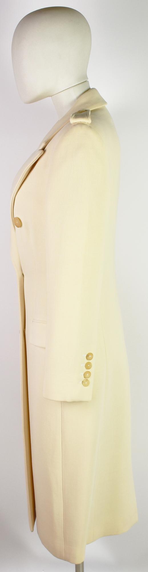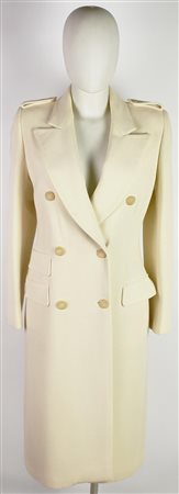 Cappotto doppiopetto in lana color avorio. Presenta tre tasche a filetto di cui due decorative. Taglia 40. Esterno 100% lana e fodera 100% cupro. Prodotto in Italia. Perfettamente conservato.
