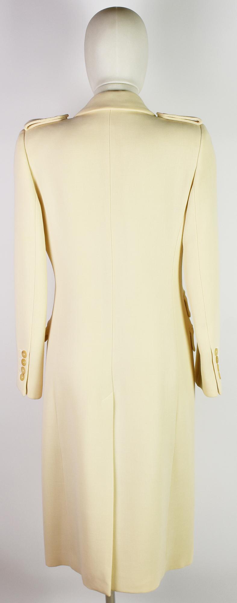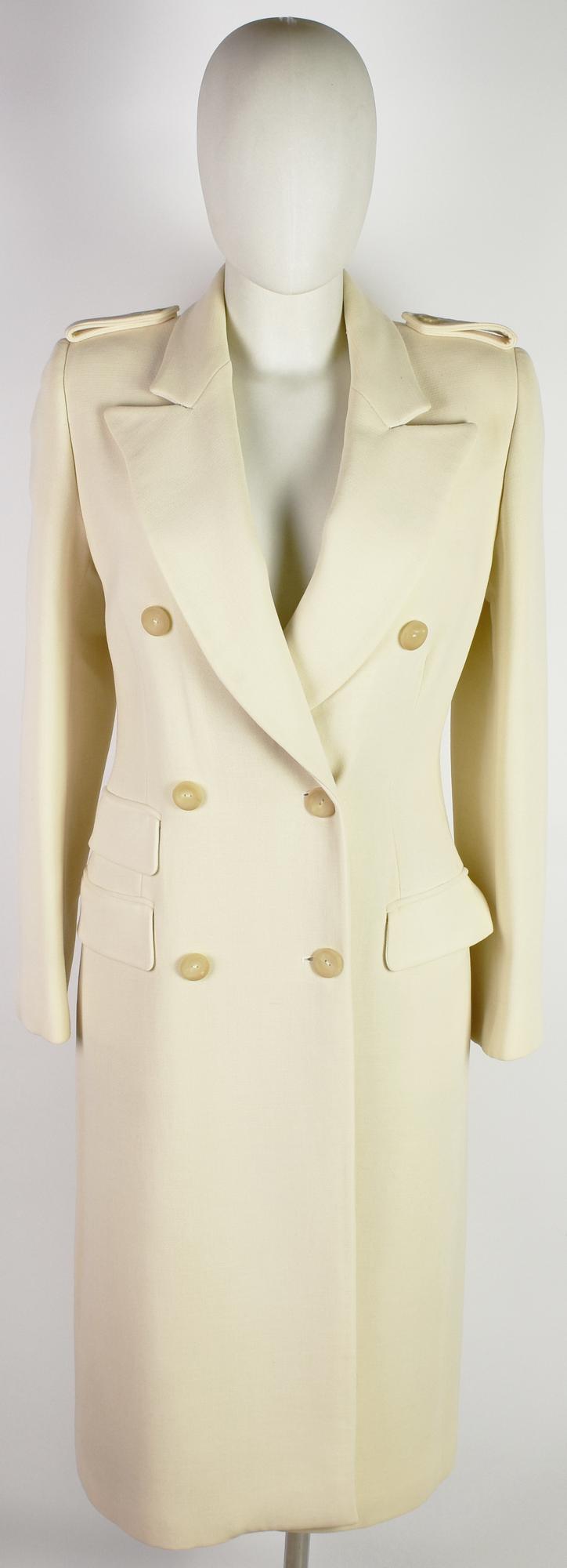 Ivory double-breasted wool coat. Features three flap pockets, two of which are decorative. Size 40. Exterior 100% wool and lining 100% cupro. Made in Italy. Perfectly preserved.