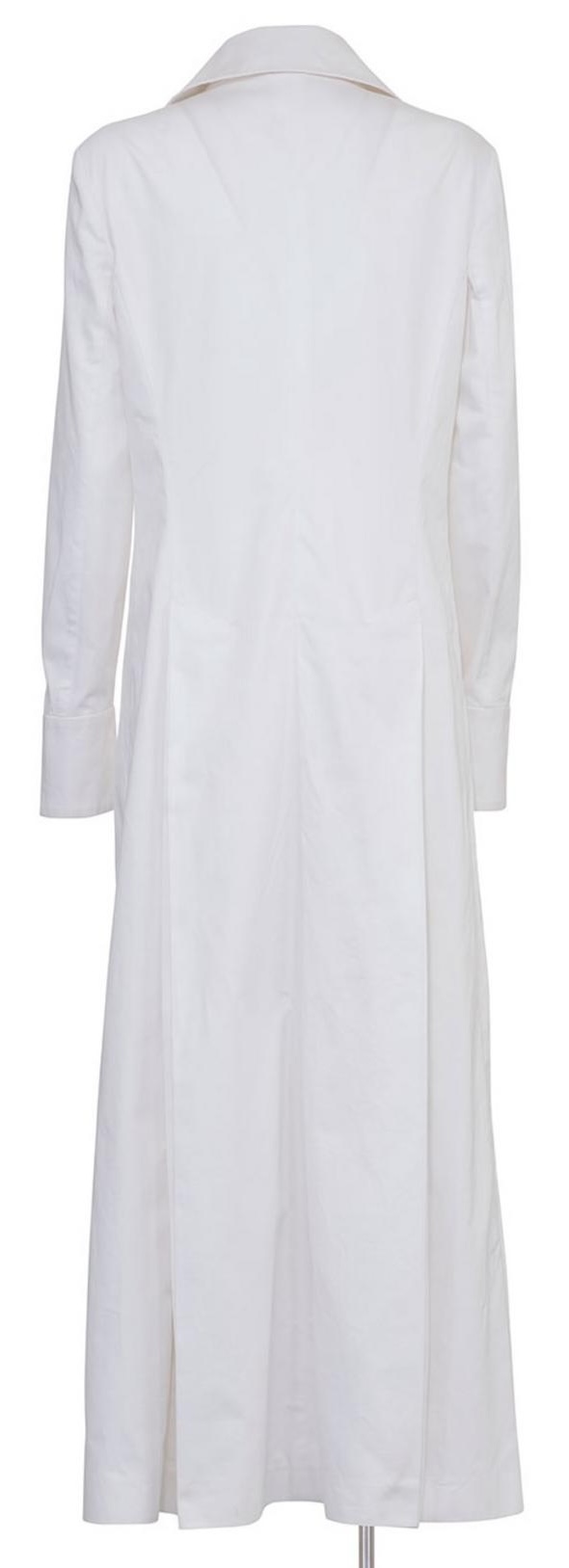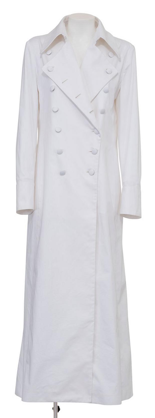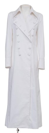 Raro cappotto lungo doppio petto della collezione Primavera Estate 2000 'The Eye'. Ampie pieghe sul retro. Due tasche sul davanti. 100% cotone. La taglia e' IT 44. Eccellente.