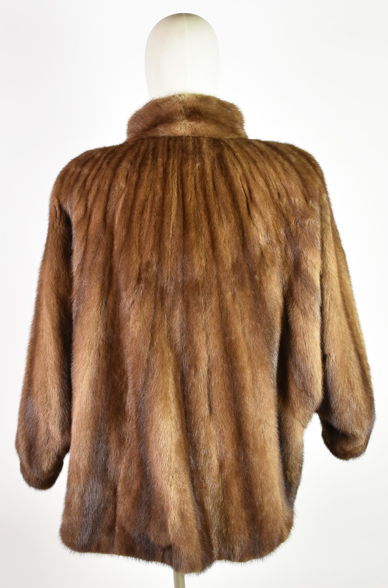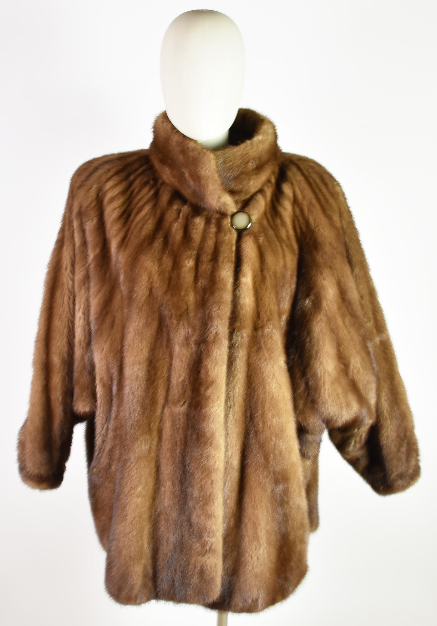 Vintage mink fur coat from Roberto Antonello furrier. Features a single button closure, batwing sleeves, and a mandarin collar. Length: 82 cm. Well preserved.