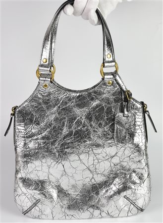 Borsa a mano modello tote bag in pelle color argento, con doppio manico. Chiusura magnetica. Interno organizzato in un unico vano con due taschini laterali, uno con cerniera e uno a soffietto. Presenta due zip sui lati e tag porta indirizzo. Hardware in metallo dorato. Cm 30x34x2,50. Altezza coi manici cm 52. Corredata di dustbag originale. Prodotta in Italia. Eccellente, pari al nuovo.