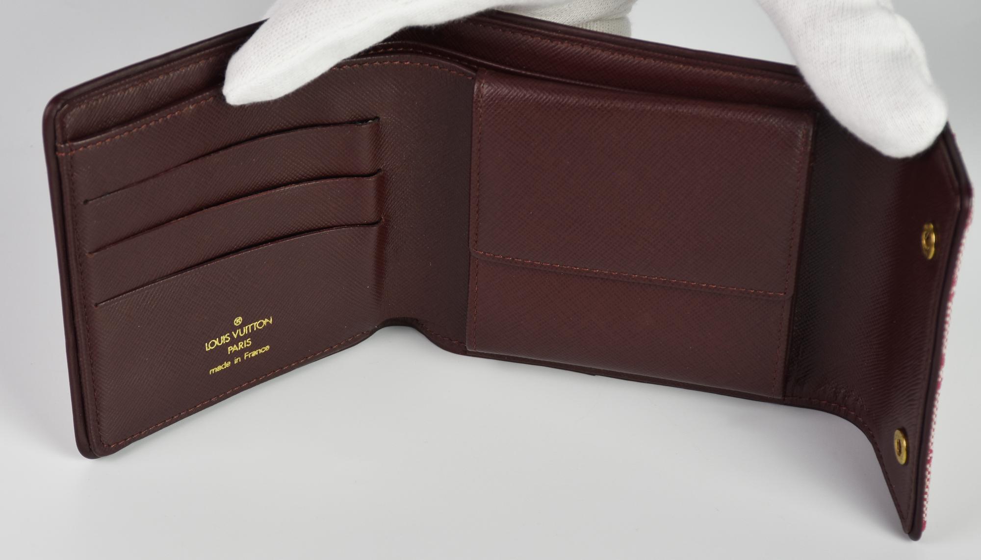 Portafoglio in canvas monogram rosa, chiuso con due bottoni a pressione. Interno in pelle bordeaux diviso in due scomparti, piu' una tasca separata per le monete con chiusura a pressione. Cm 11,50x10,50. Prodotto in Francia. Ben conservato.