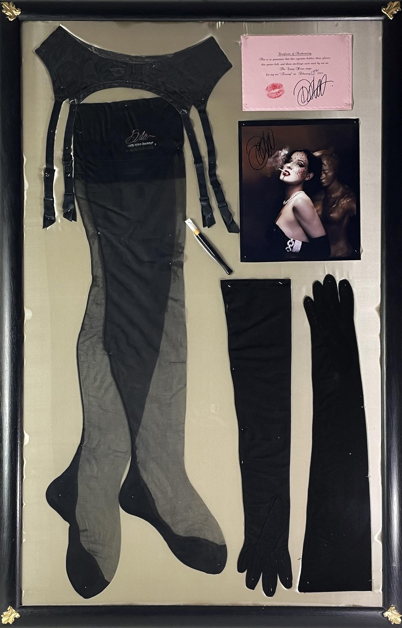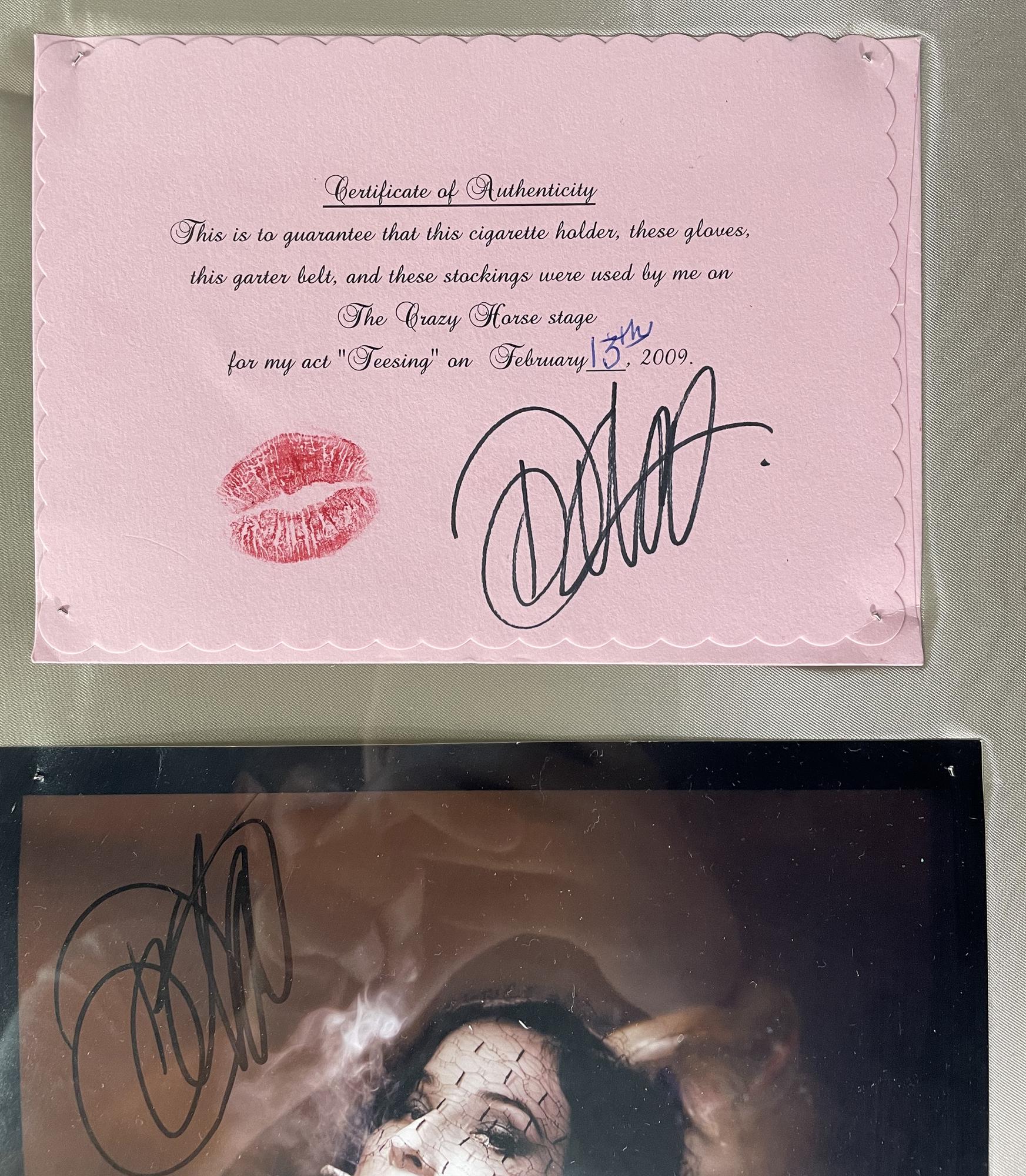 Gloves, cigarette holder and cigarette, garter belt and stockings (Dita by Secrets in Lace) used on The Crazy Horse stage for the act 'Teesing' 13th February 2009 accompanied with a signed photo and the Certificate of Autenticity. Excellent condition.