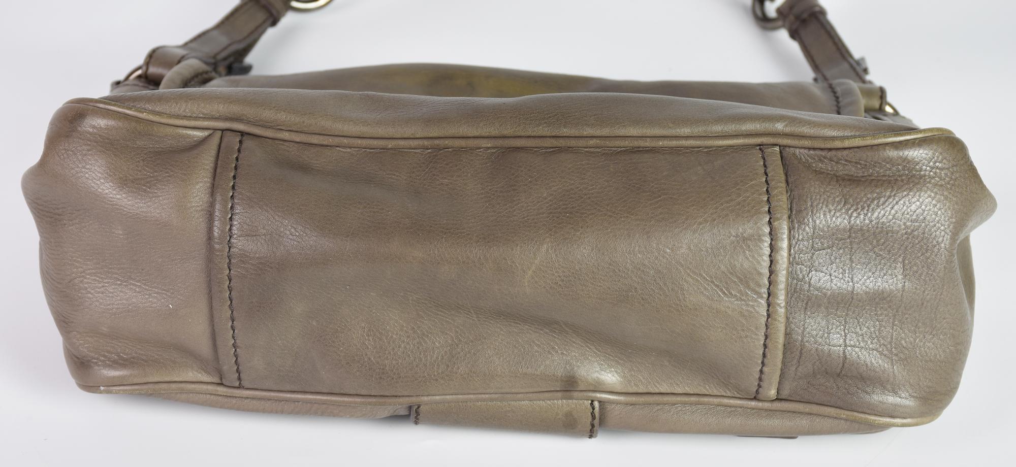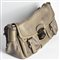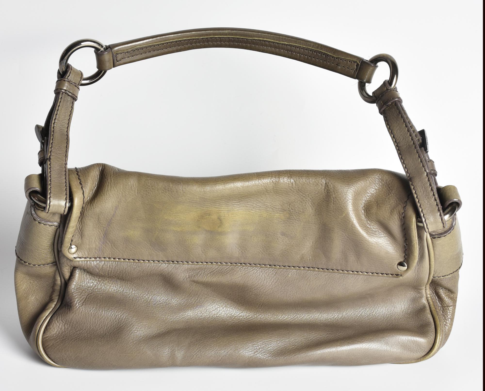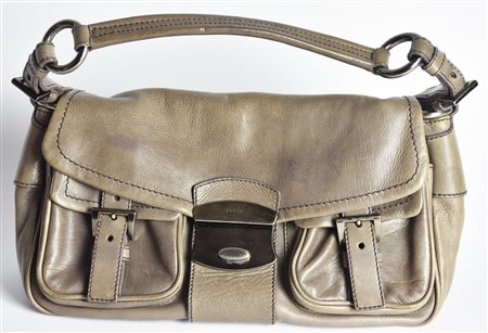 Borsa a spalla in pelle con chiusura a scatto. Interno organizzato in un unico vano con un taschino laterale con cerniera. All'esterno reca due tasche frontali con chiusura con fibbia. Hardware in metallo cromato. Cm 26x18x10. Prodotto in Italia. Ben conservata.