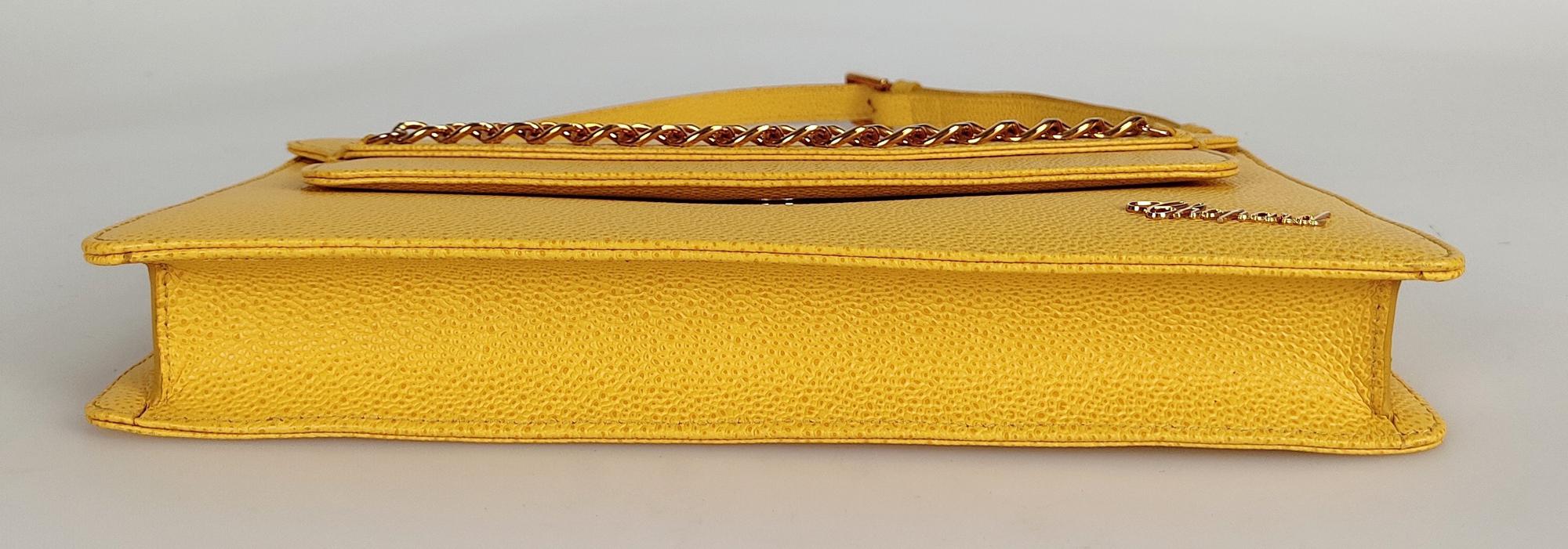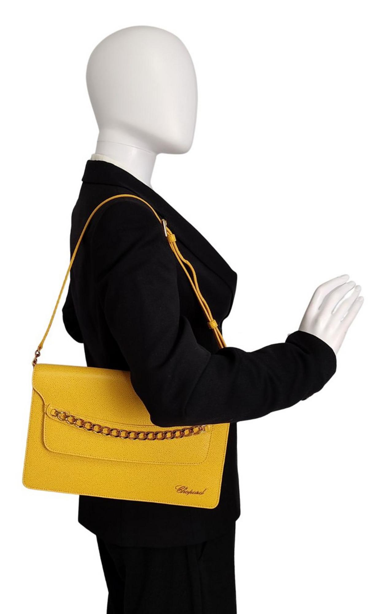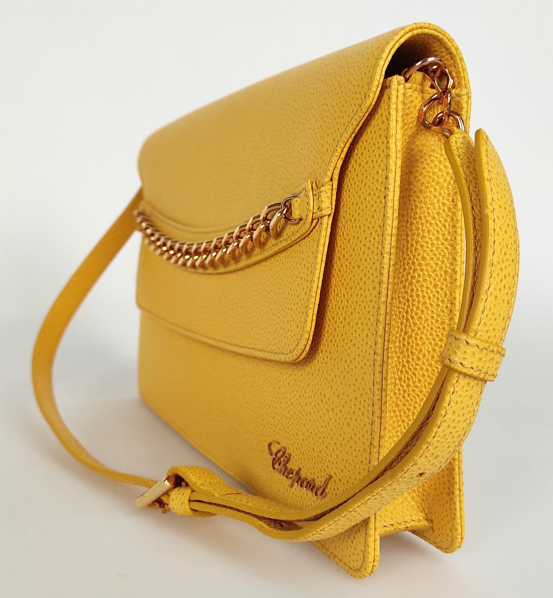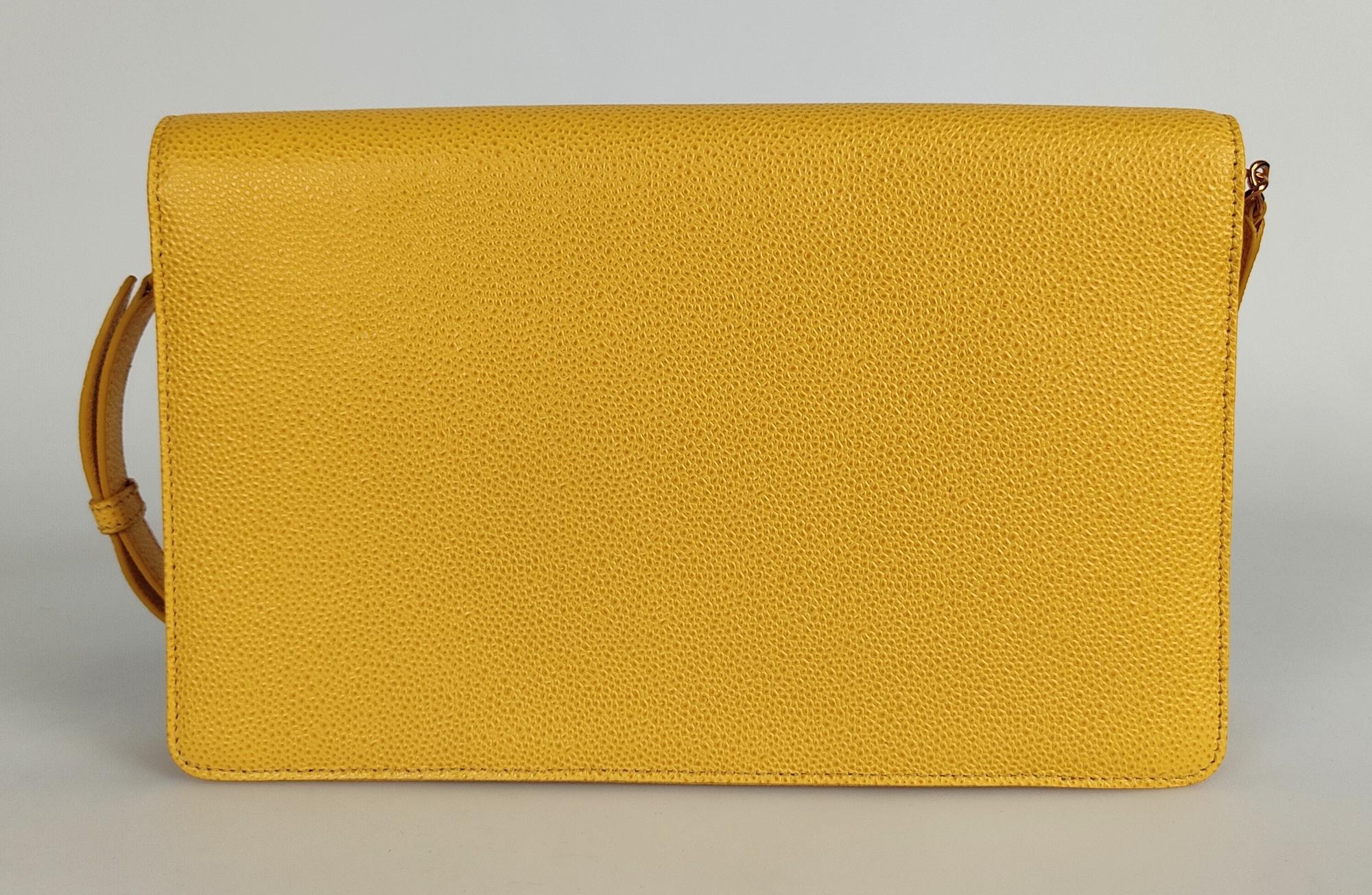 In yellow grained leather with golden metal accessories.
