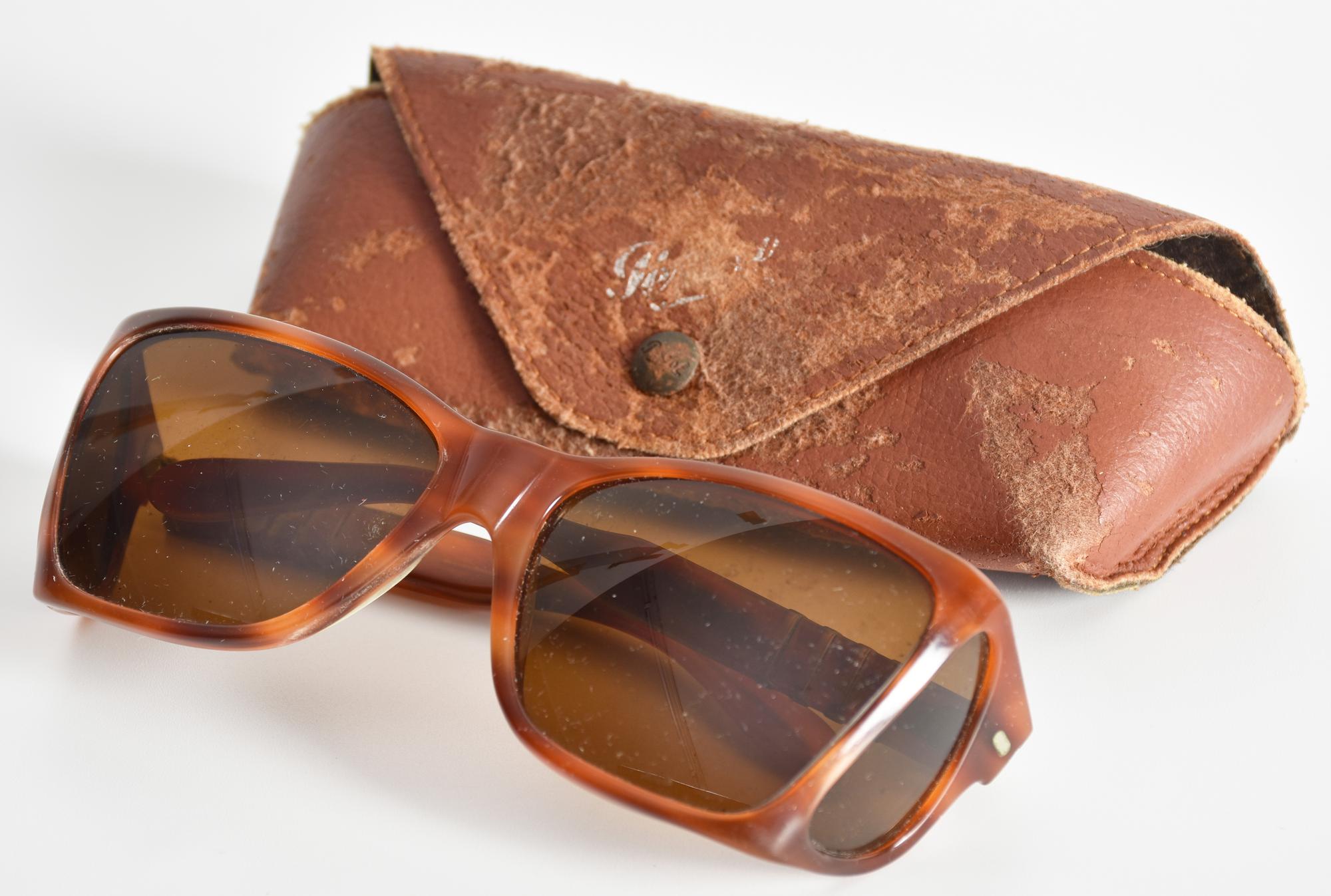 Vintage sunglasses of the iconic four-lens version. Tortoiseshell frame with brown lenses. Original case. Metal parts oxidized. Fairly well preserved.