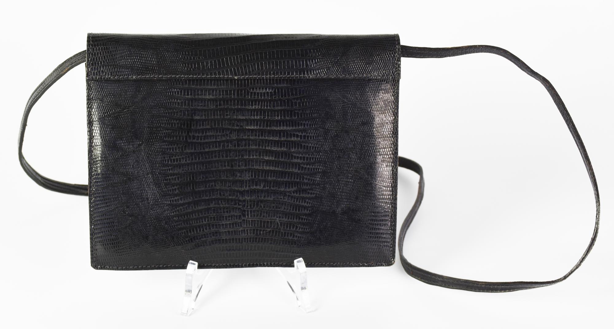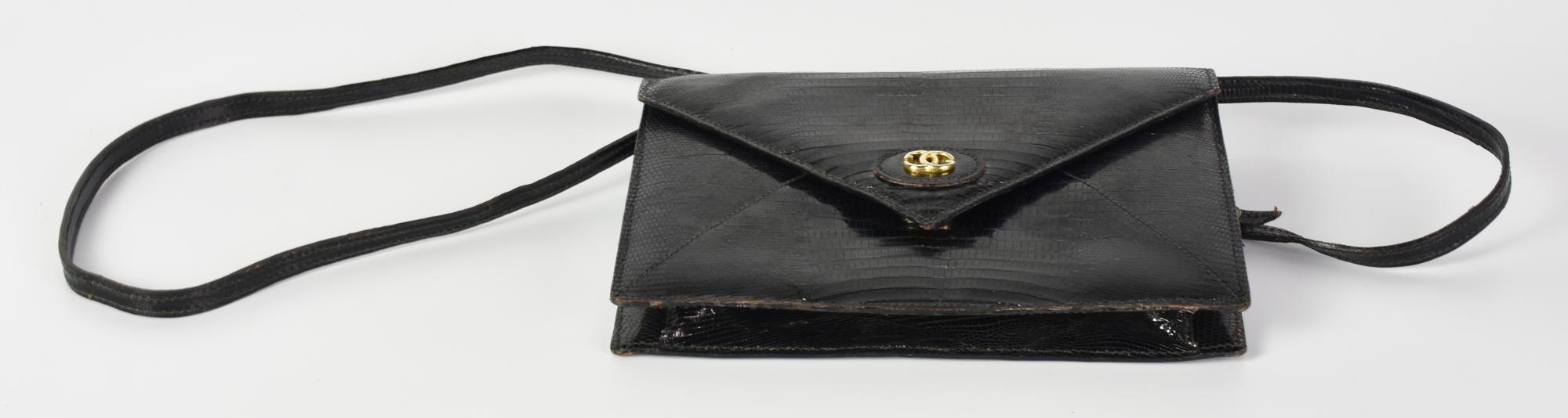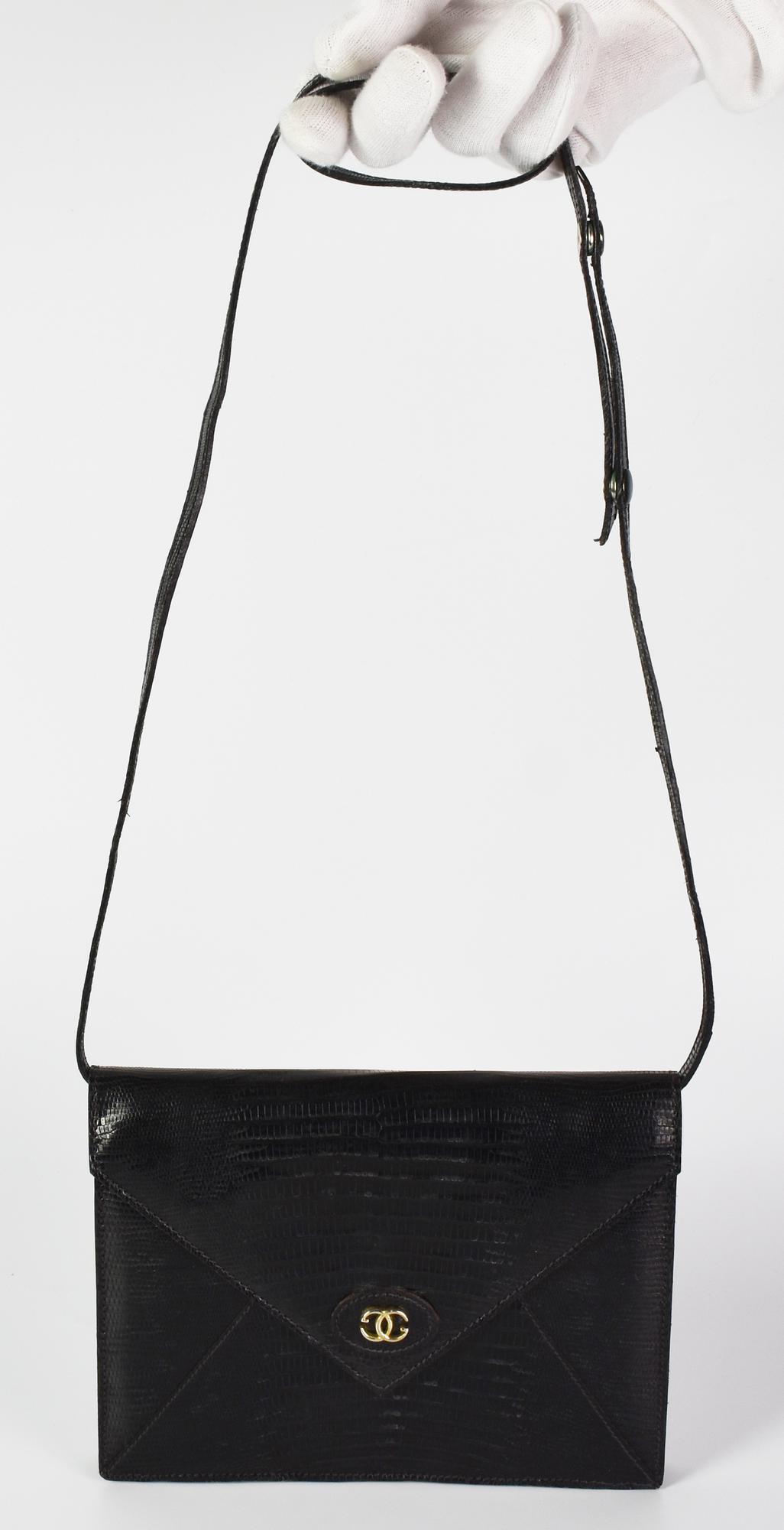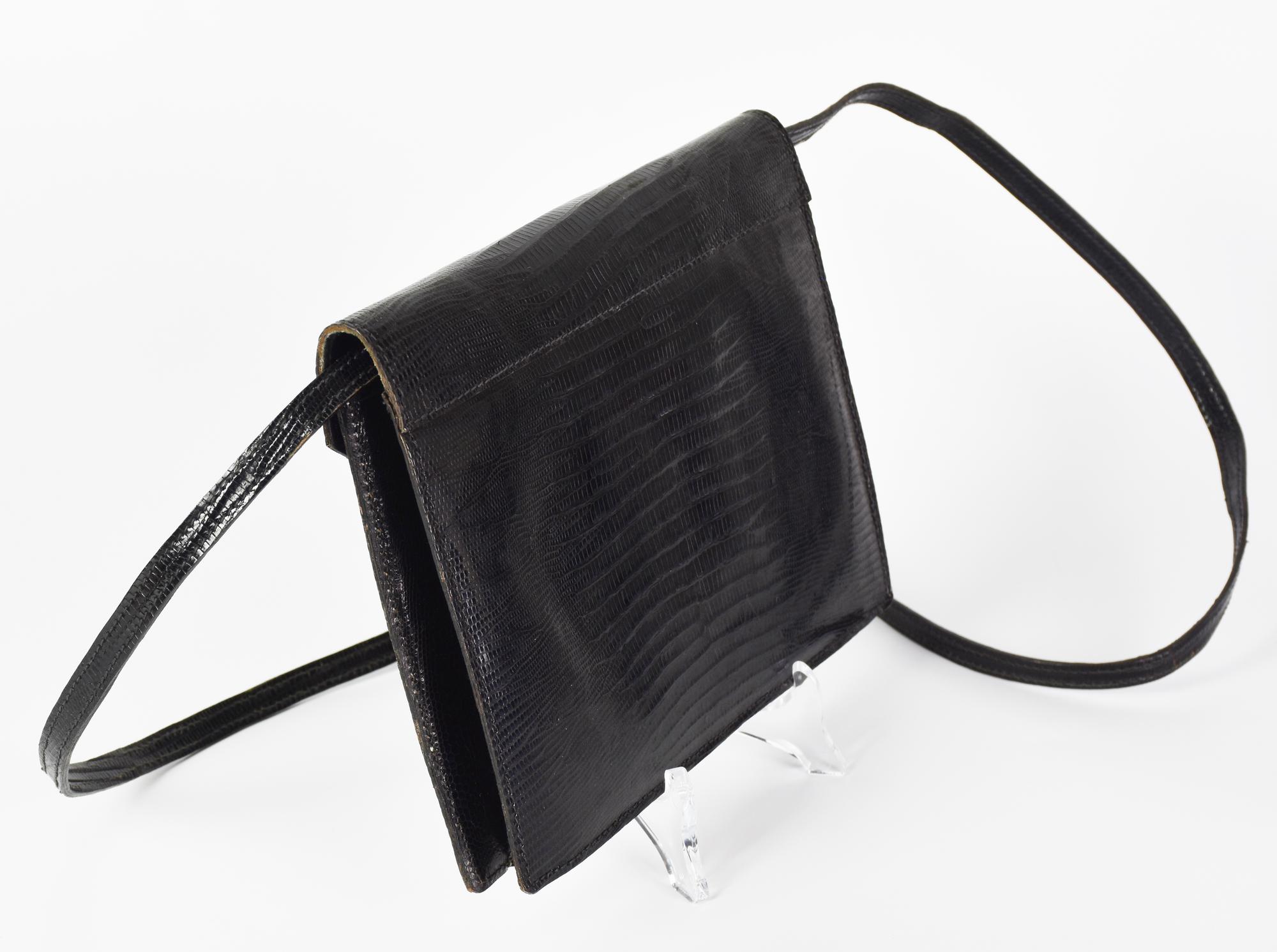 Piccola postina vintage in pelle di lucertola. Interni in pelle nera con due taschini laterali, uno con chiusura a cerniera. Chiusura a pressione con logo della Maison. Tracolla rimovibile sempre in lucertola. Cm 20x15,50x4. Difetti e segni d'uso. Discretamente conservata.