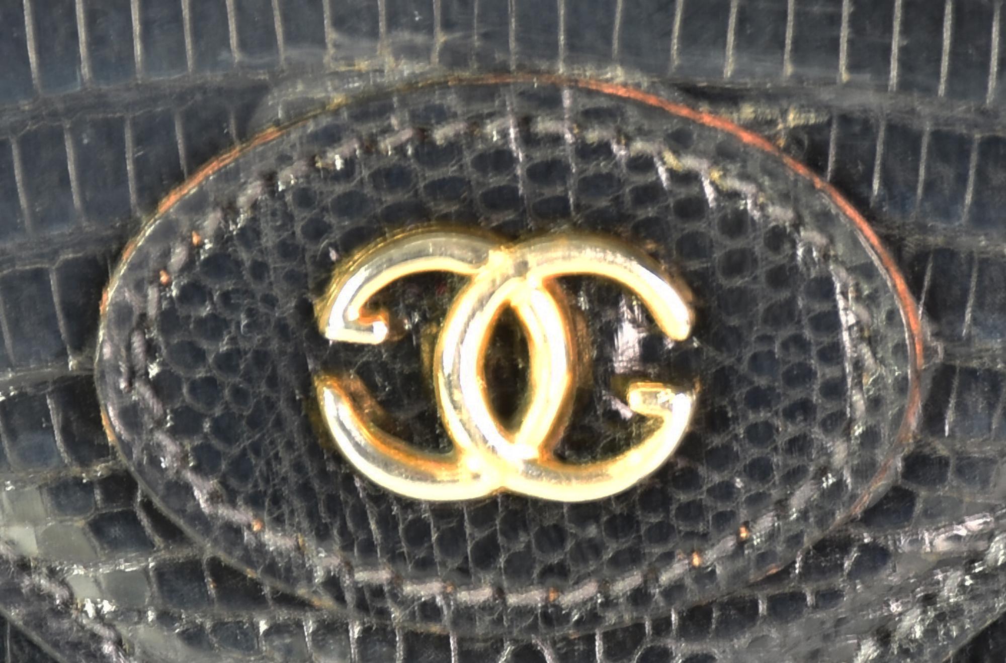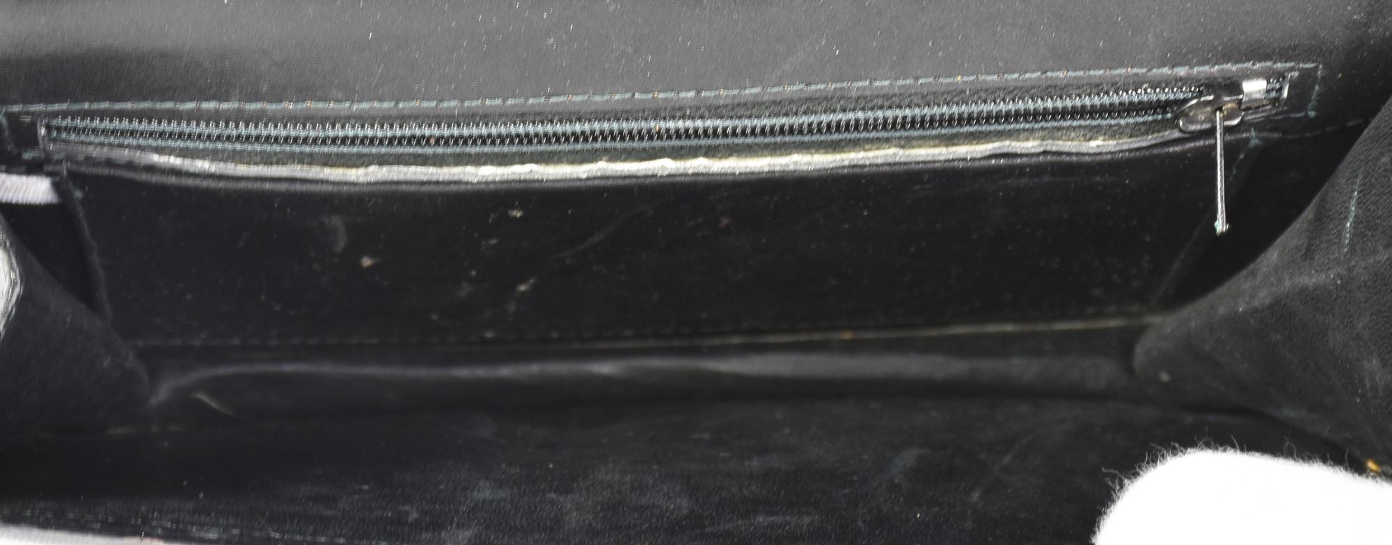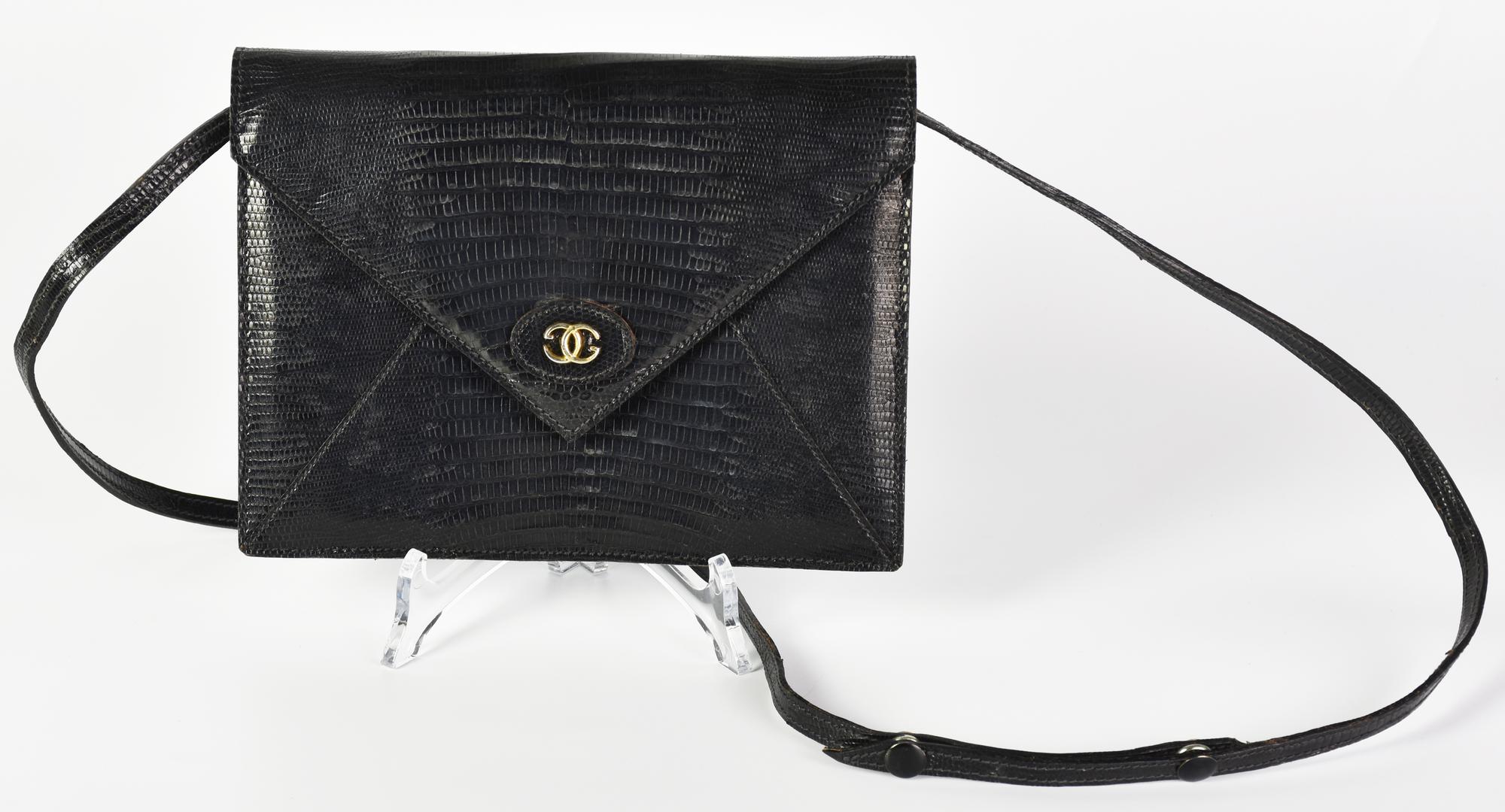 Piccola postina vintage in pelle di lucertola. Interni in pelle nera con due taschini laterali, uno con chiusura a cerniera. Chiusura a pressione con logo della Maison. Tracolla rimovibile sempre in lucertola. Cm 20x15,50x4. Difetti e segni d'uso. Discretamente conservata.