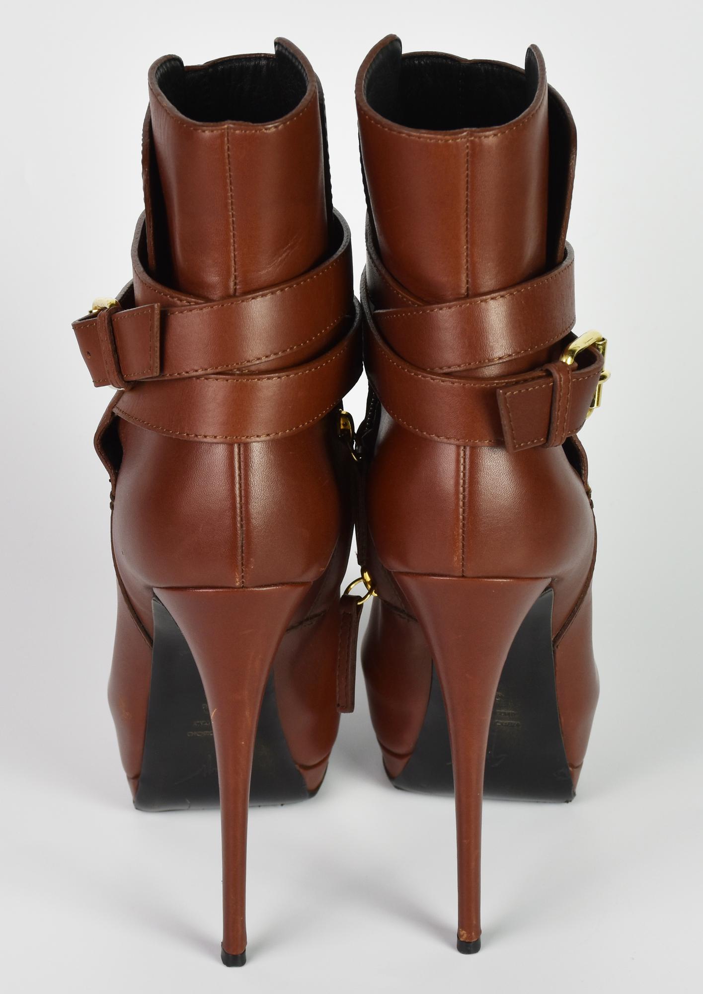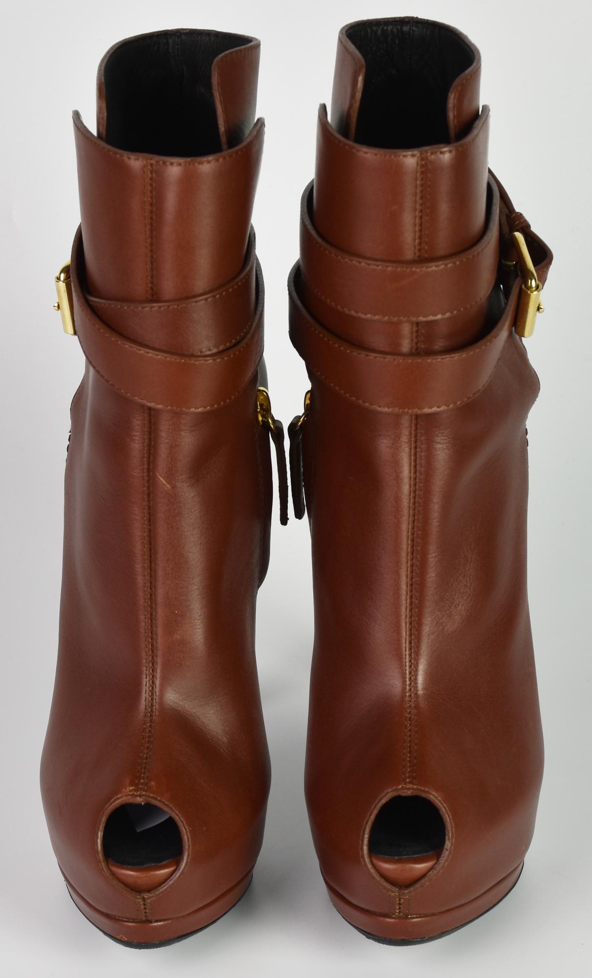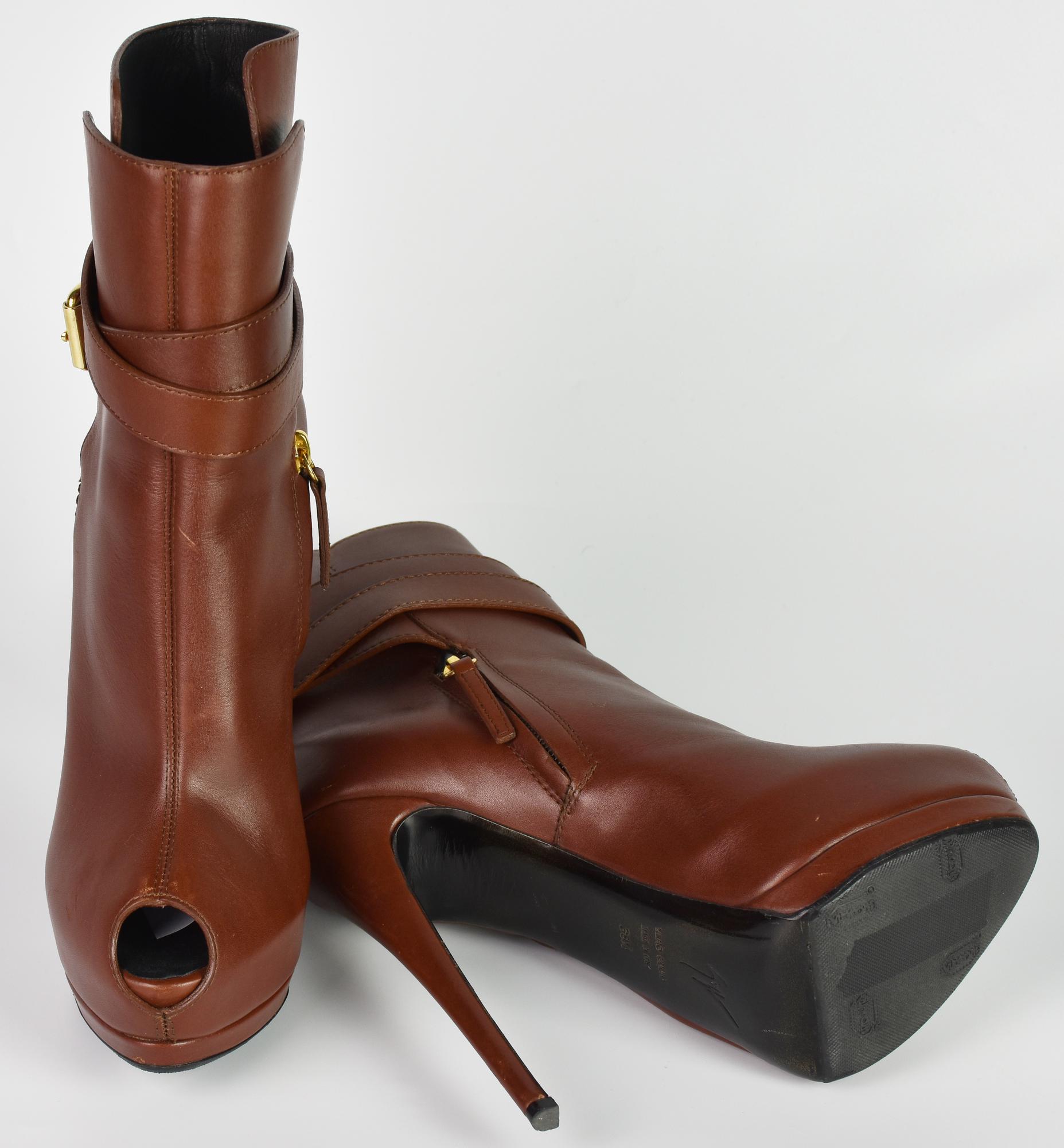 Open-toe leather ankle boots with platform. Closed with lace, buckle, and side zipper. Heel height: 15 cm, platform height: 4 cm. Size 38,5 IT. Made in Italy. Slight signs of wear that do not compromise the excellent overall condition. Well preserved.