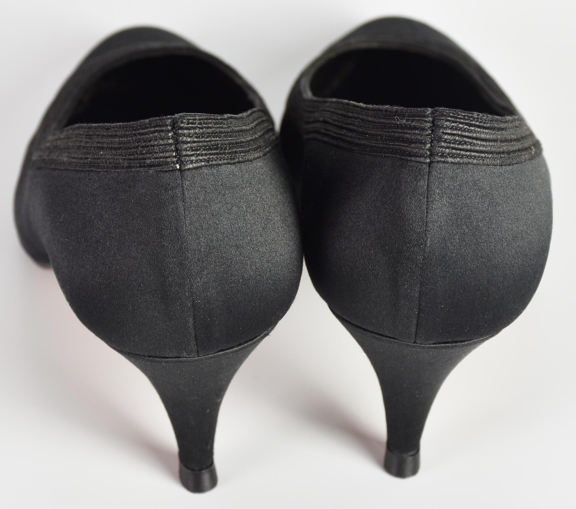 Decolletee shoes in black satin and matching trimmings. Heels 6.5 cm. Size 39 IT. 1990s. Made in Italy. Well preserved.