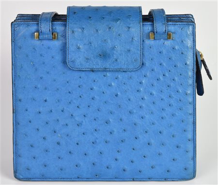 Light blue ostrich leather bag with three compartments and bellows closure, 25x27x6 cm, handle width 27 cm. Laurence, Turin. Well preserved.