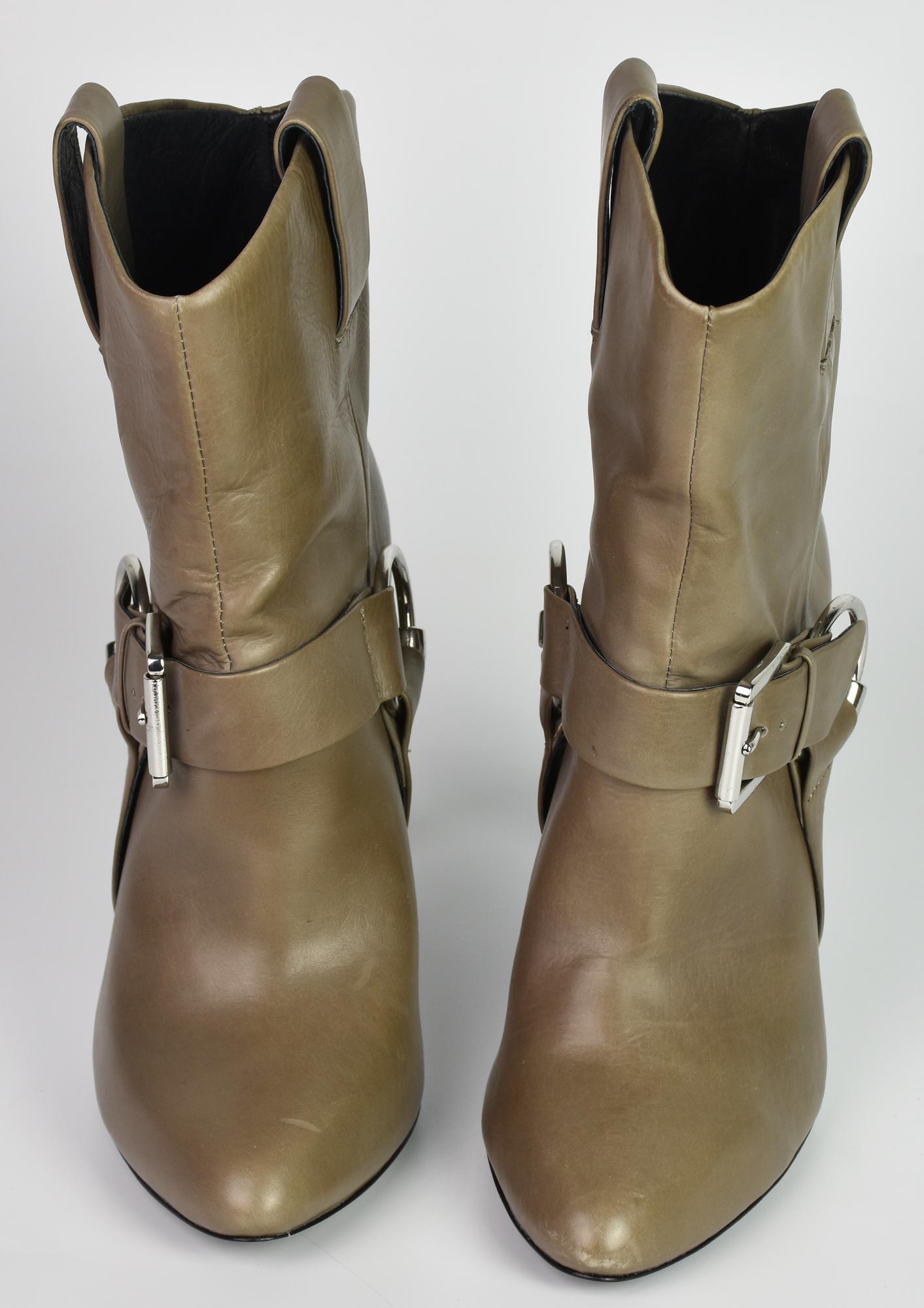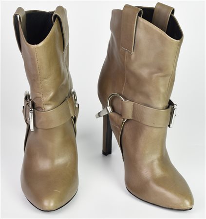 Tronchetto in vera pelle color tortora con dettaglio in metallo. Tacco di 11 cm. Taglia 7. Lievi segni d'uso. Ben conservato.