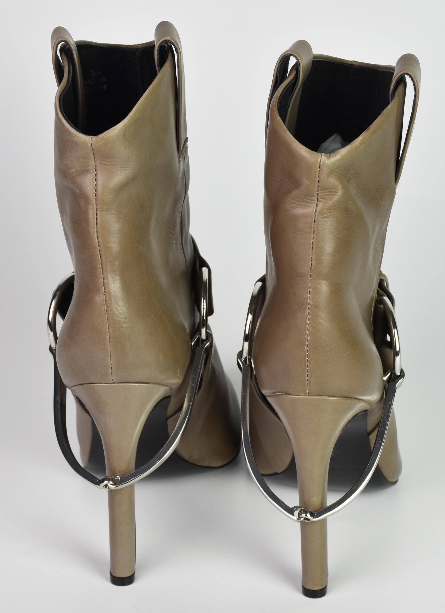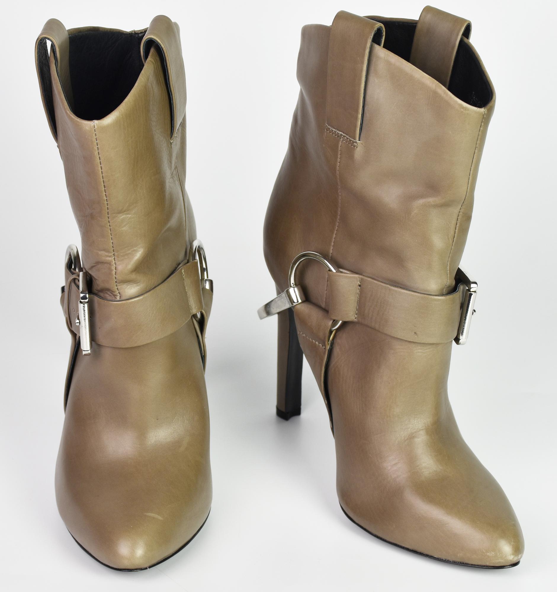 Taupe genuine leather ankle boot with metal detail. Heel height of 11 cm. Size 7. Slight signs of wear. Well preserved.