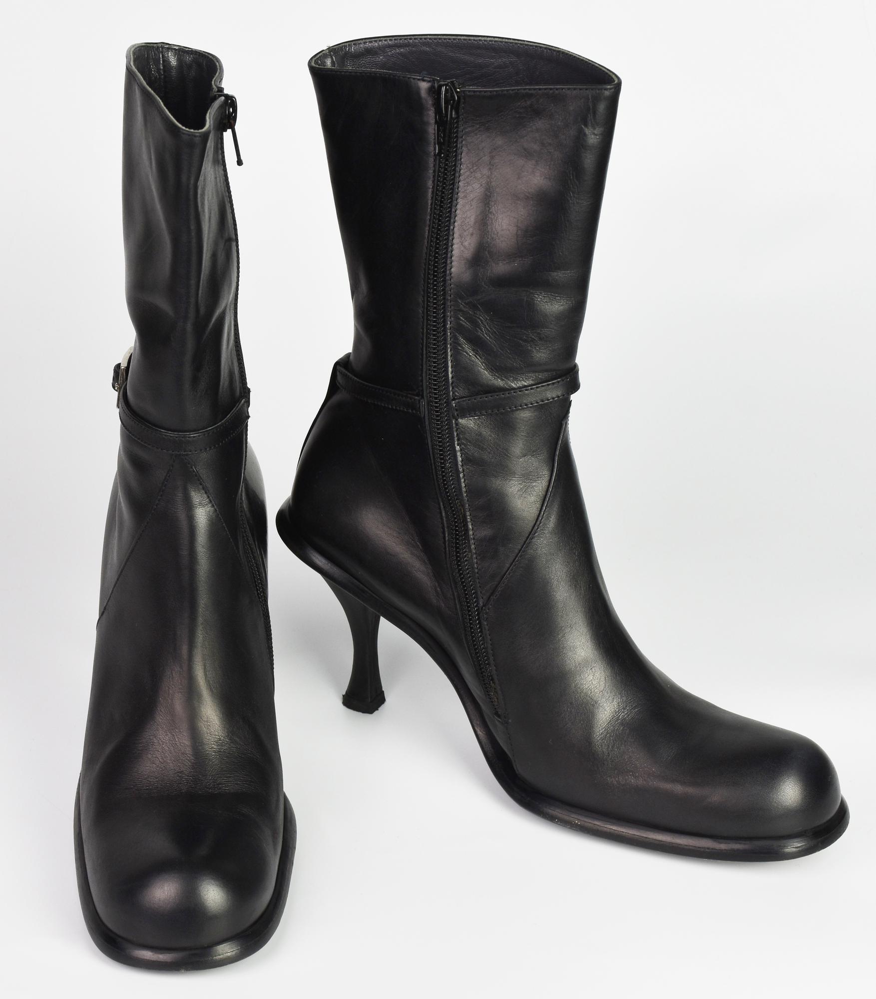 Stivali neri in pelle di vitello con cerniera laterale. Interni in pelle. Tacco 9 cm. Con scatola originale. Taglia 37.5 IT. Prodotti in Italia. Perfettamente conservati.