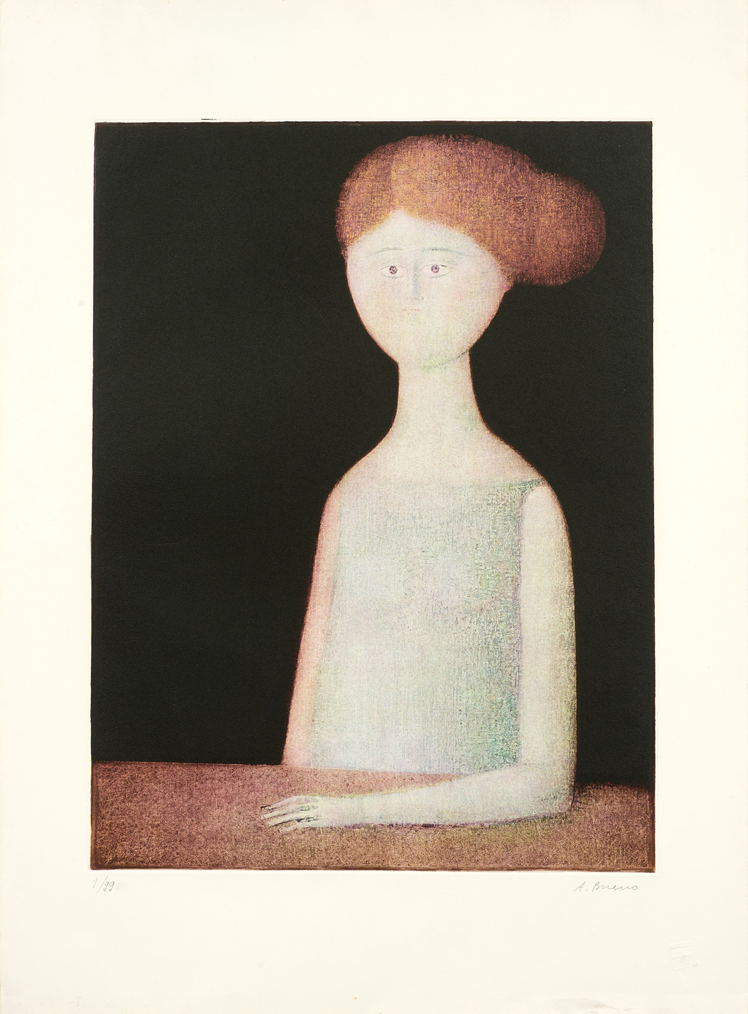 Firma a matita sul margine in basso a destra: A. Bueno, timbro a secco Calco / Grafica / Studio, tiratura in basso a sinistra: 1/99.