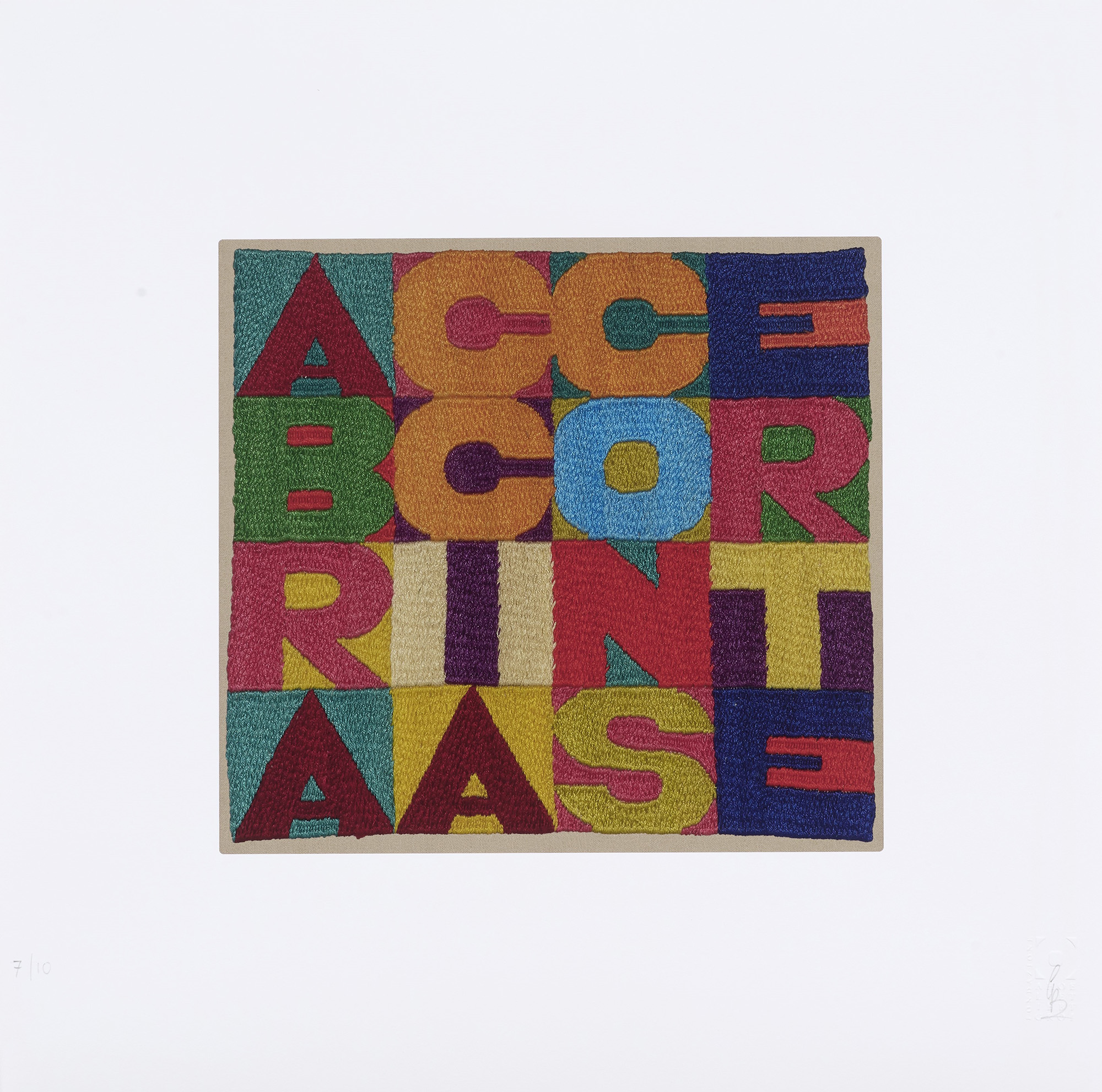 Timbro a secco Fondazione Alighiero Boetti in basso a destra con firma a matita di Giordano Boetti, tiratura in basso a sinistra: 7/10.