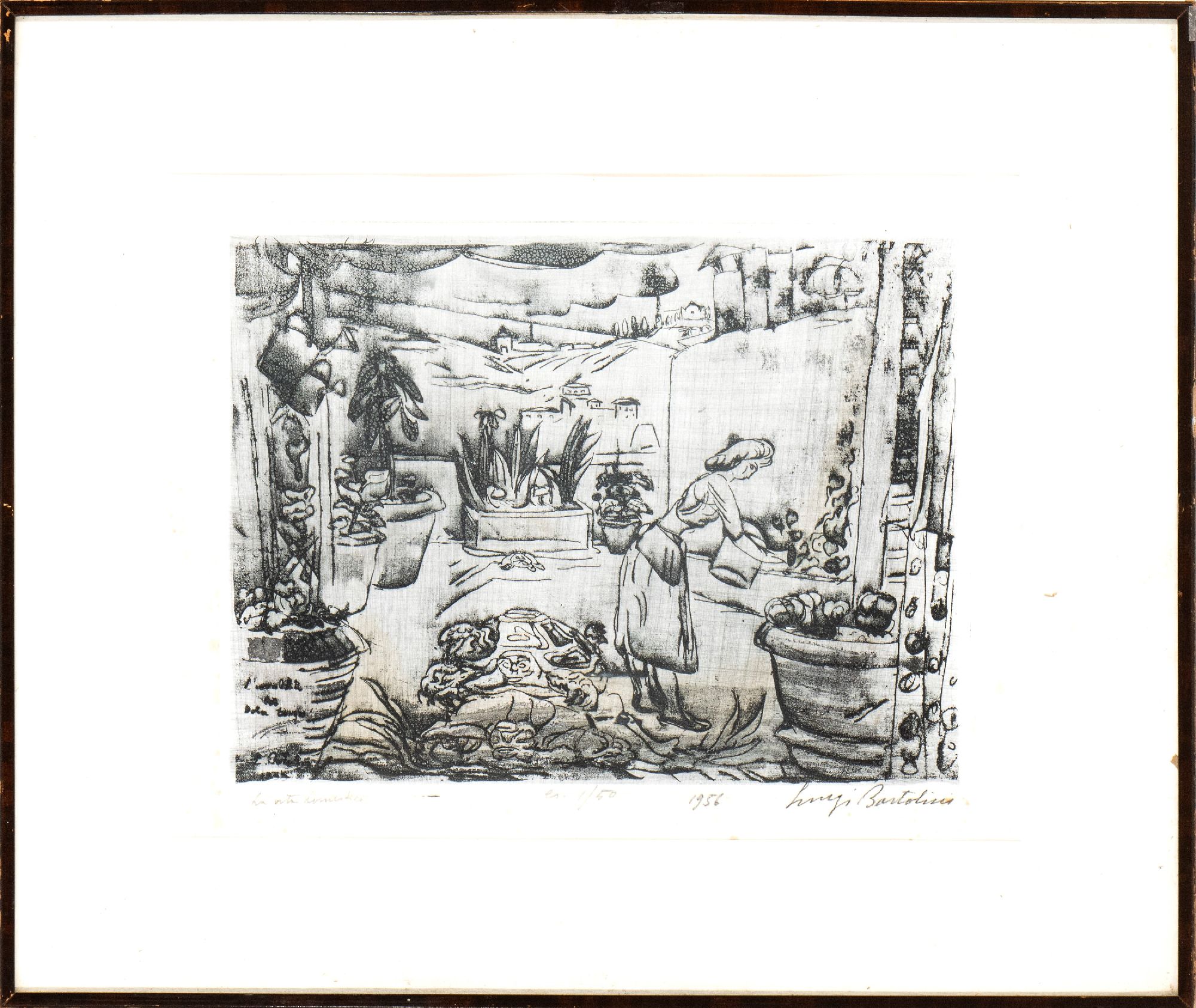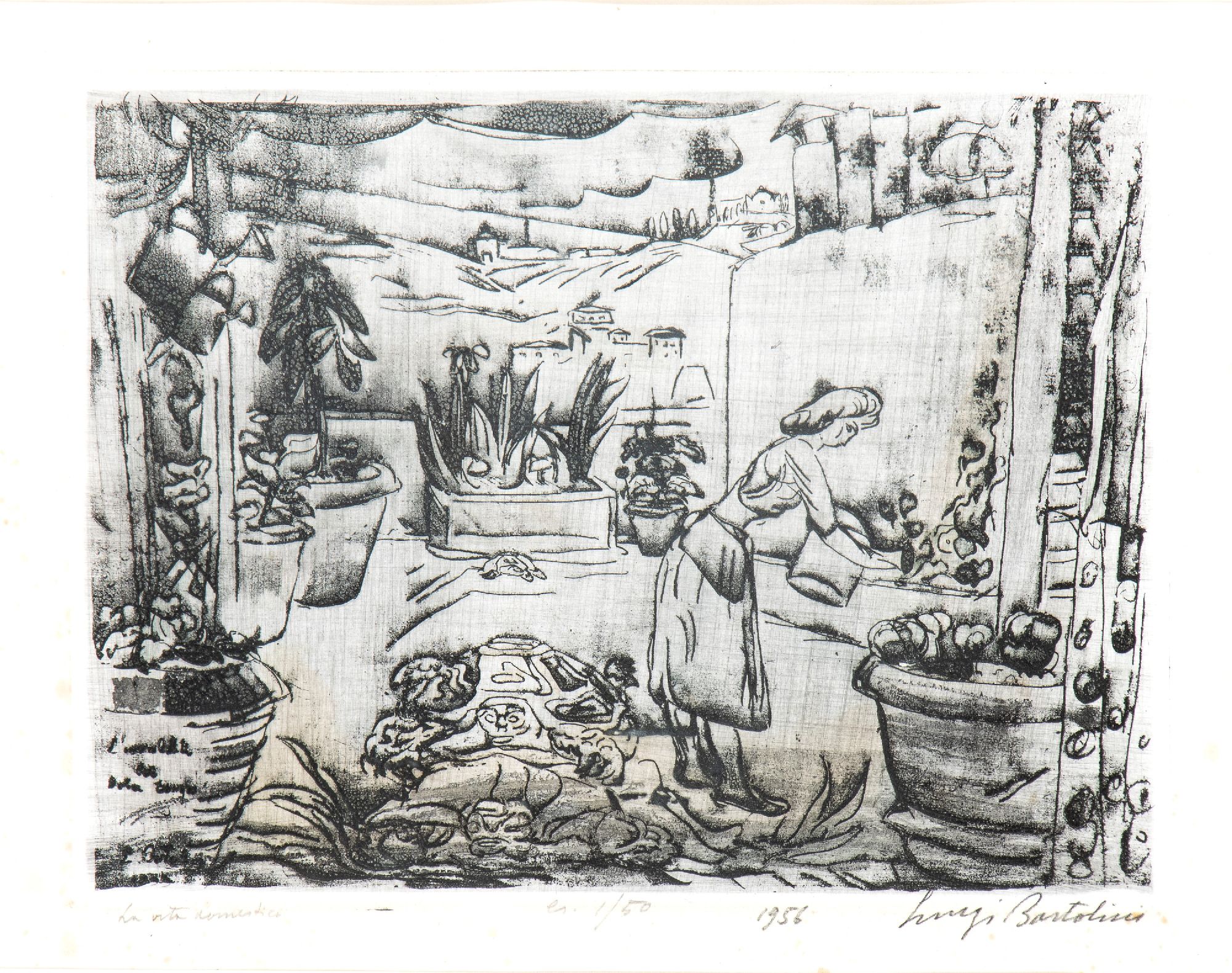 Firmato e datato in basso a destra: Luigi Bartolini, 1956, tir. 1/50, titolato in basso a sinistra: La vita domestica