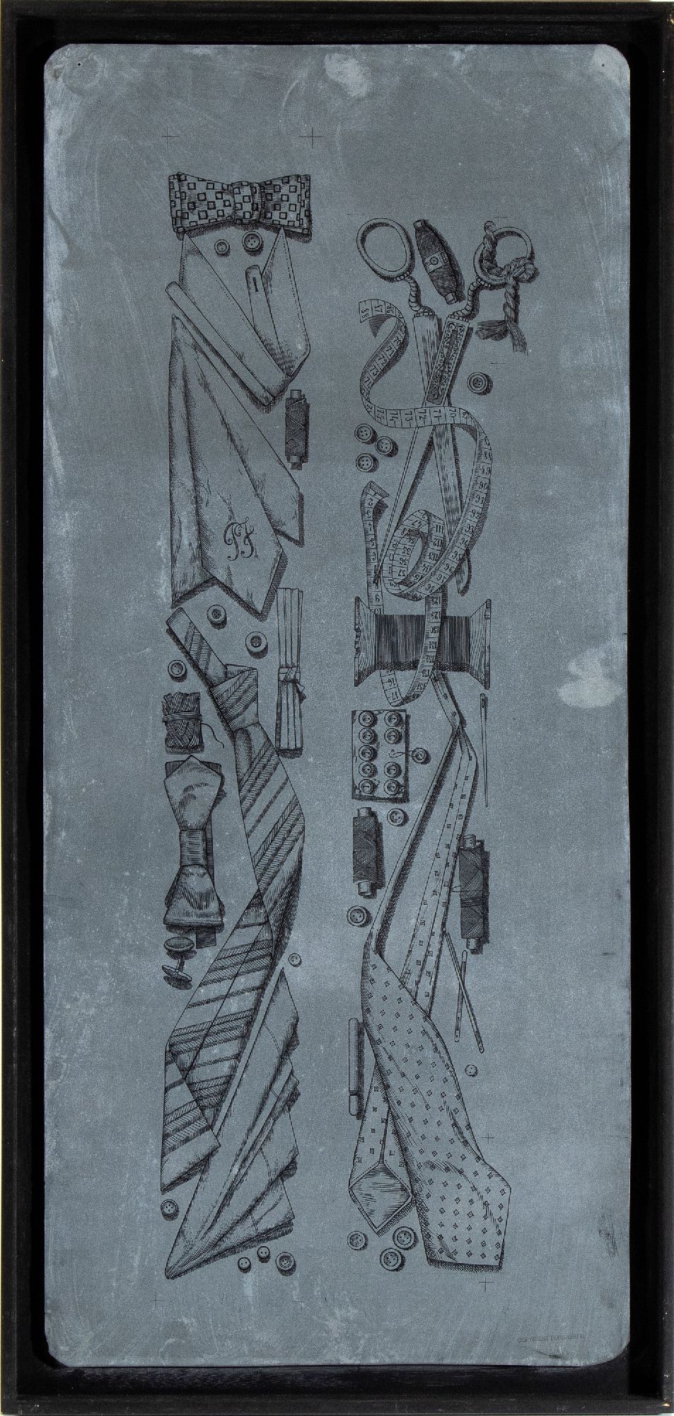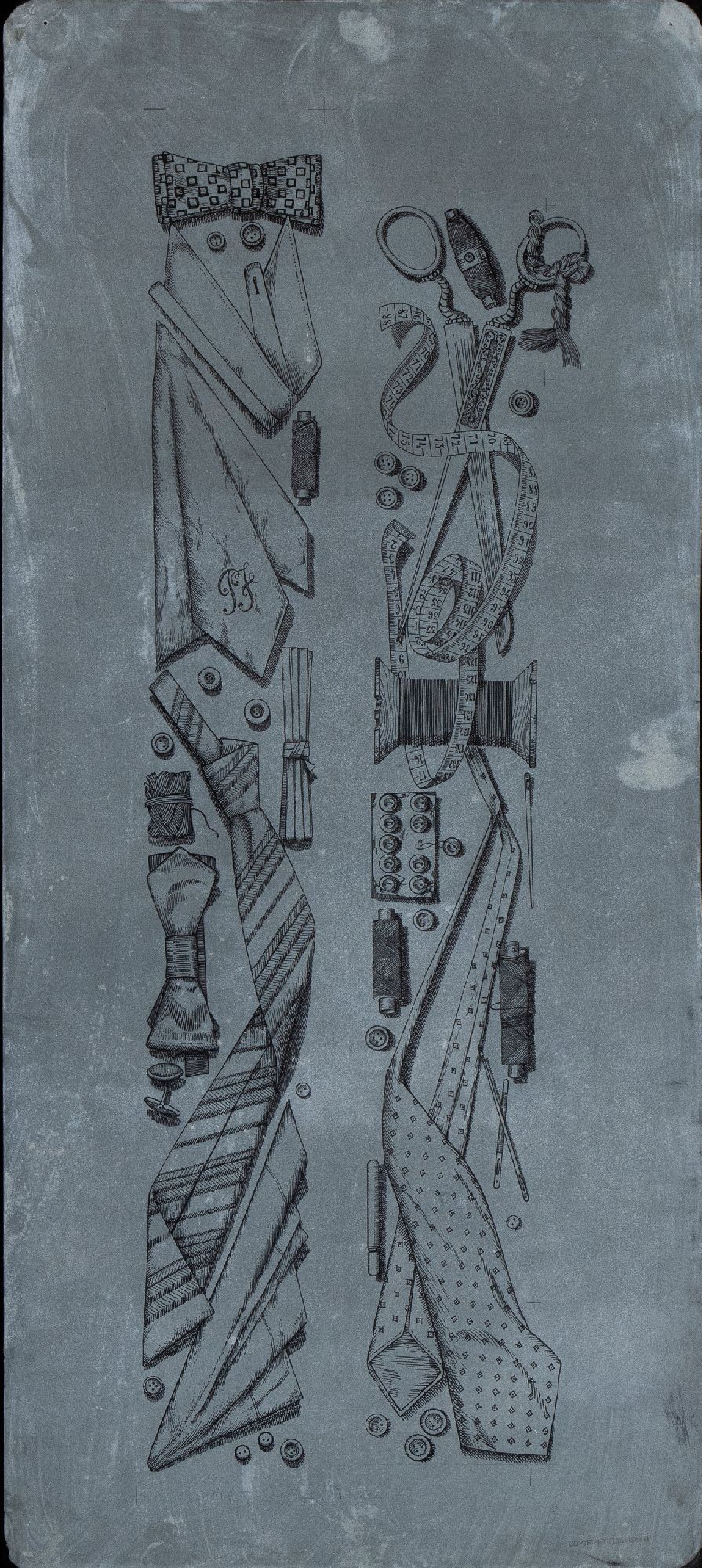 Decorazioni che incorniciavano i 10 pannelli di “Storia della moda” degli anni ’60, timbro "Copyright Fornasetti" in basso a destra