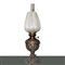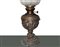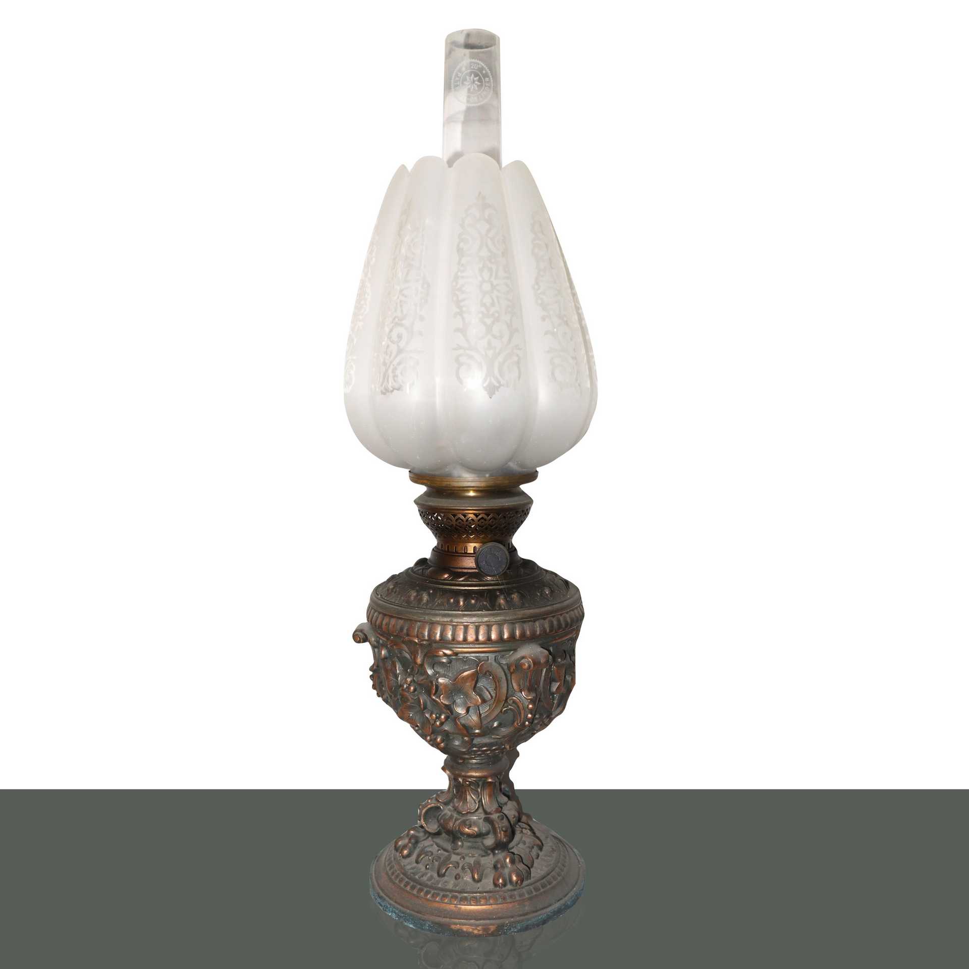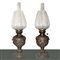 Coppia di lumi a petrolio con base in ottone sbalzato a rilievo con motivi floreali, 19° secolo