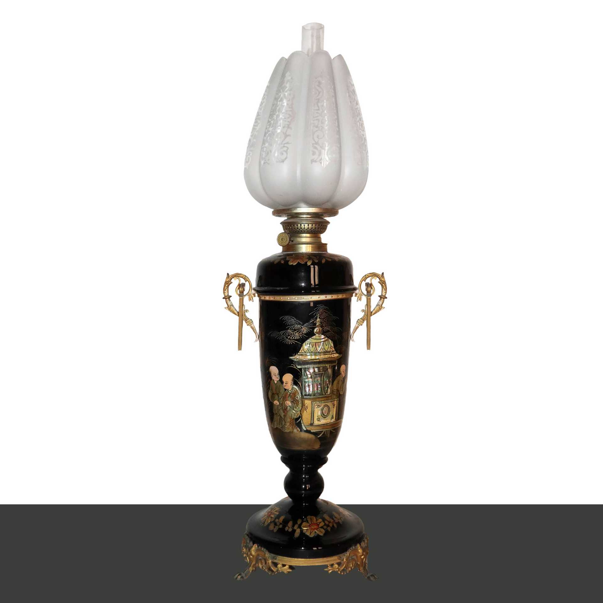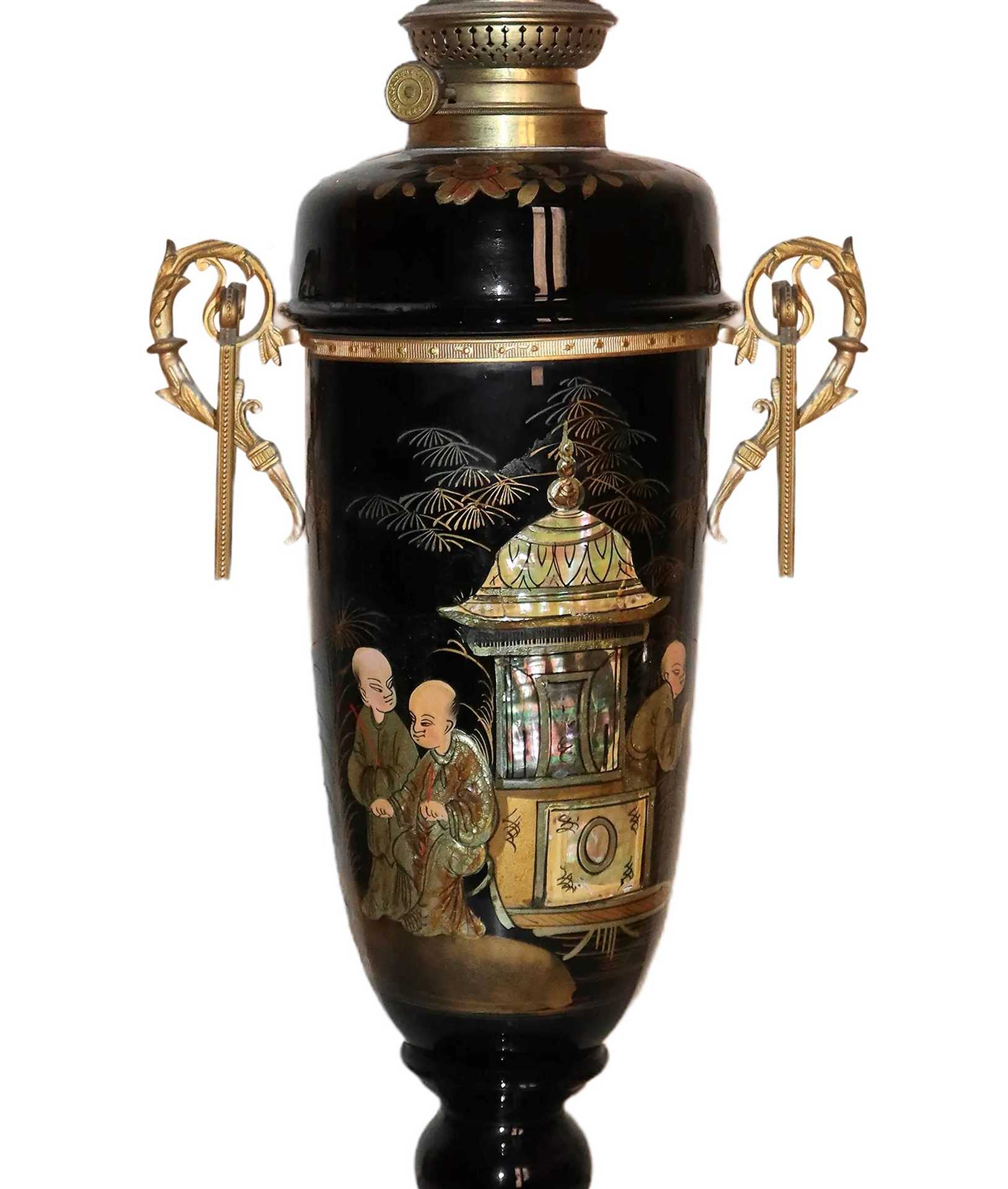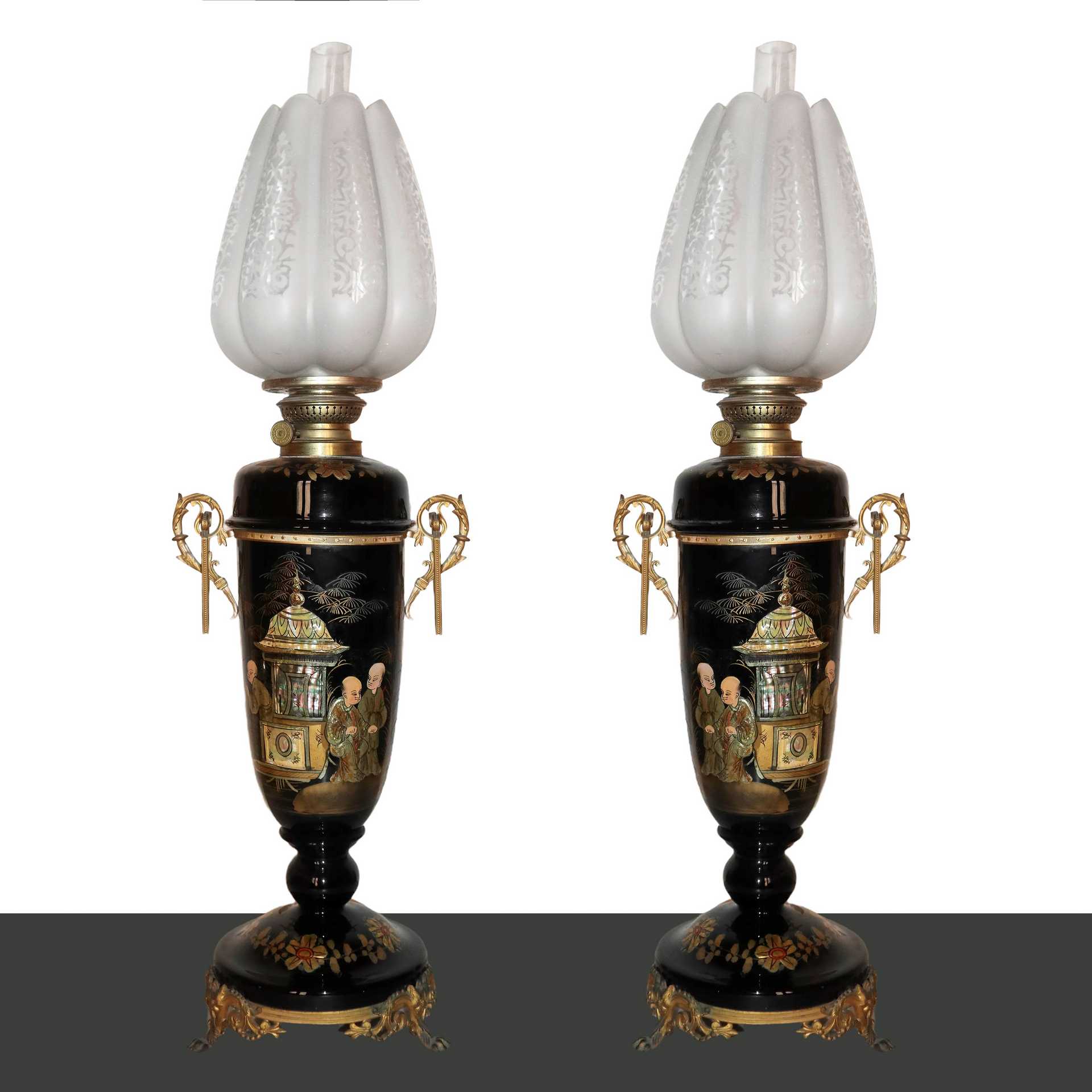 Coppia di lumi in porcellana dipinta con cineserie H cm 65 A smalti e in madreperla, avorio e oro, applicazioni in ottone dorato, diffusore in vetro a tulipA smalti e in madreperla, avorio e oro, applicazioni in ottone dorato, diffusore in vetro a tulip