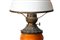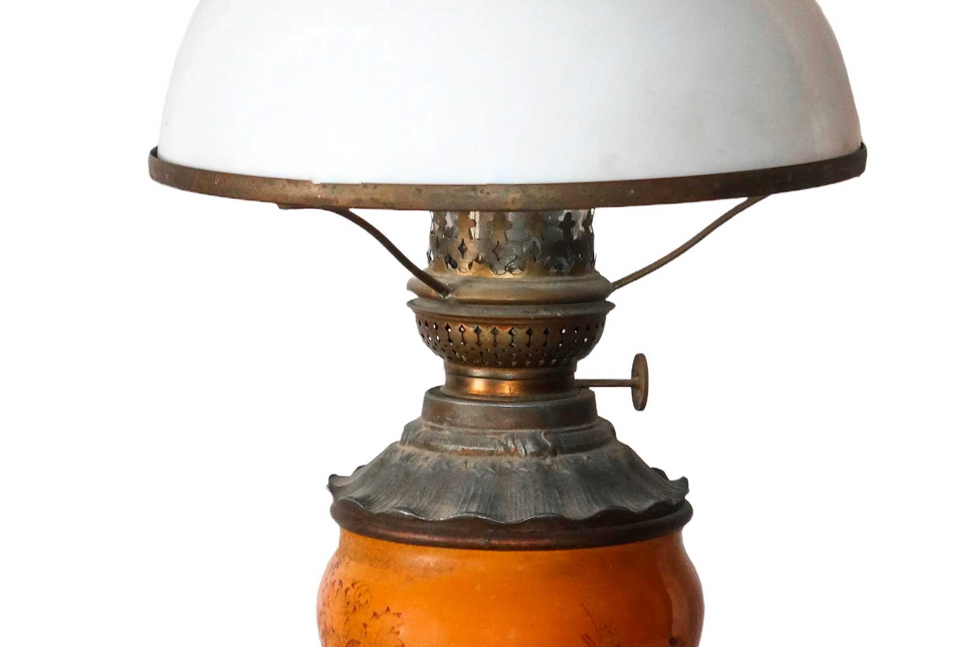 Coppia di lumi a petrolio con disegni floreali , 19° secolo H cm 53 Paralume in opaline bianca, piede in metallo e base in maiolica.Paralume in opaline bianca, piede in metallo e base in maiolica.