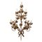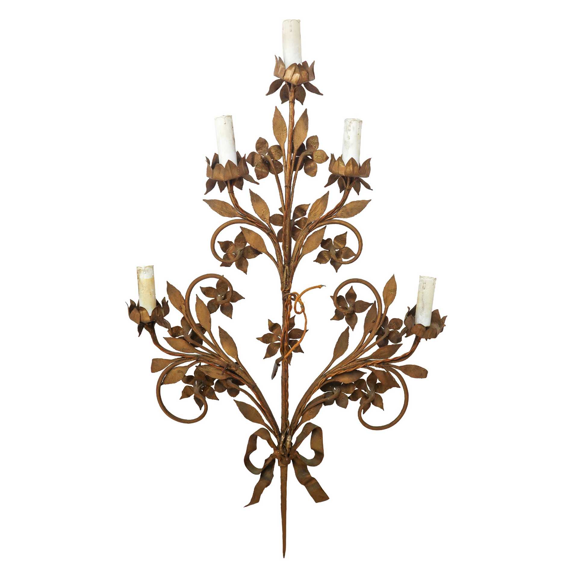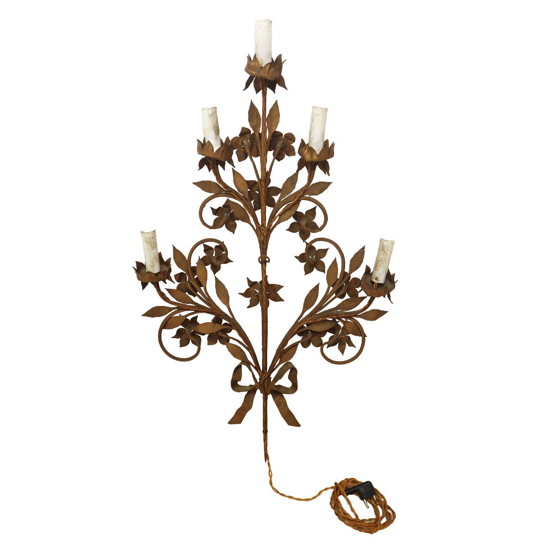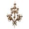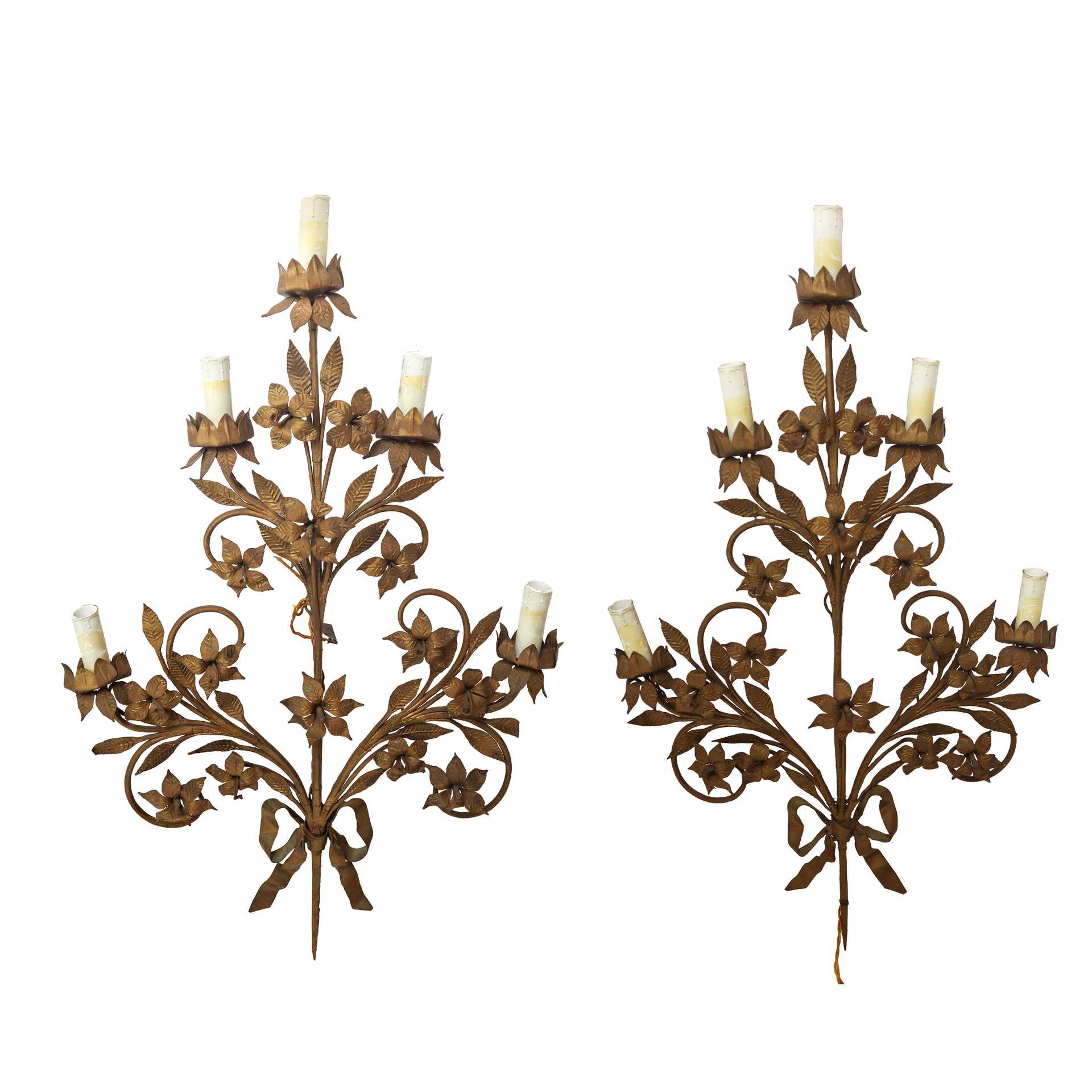 Coppia di appliques a 5 luci in metallo dorato lavorato a foglie e fiori