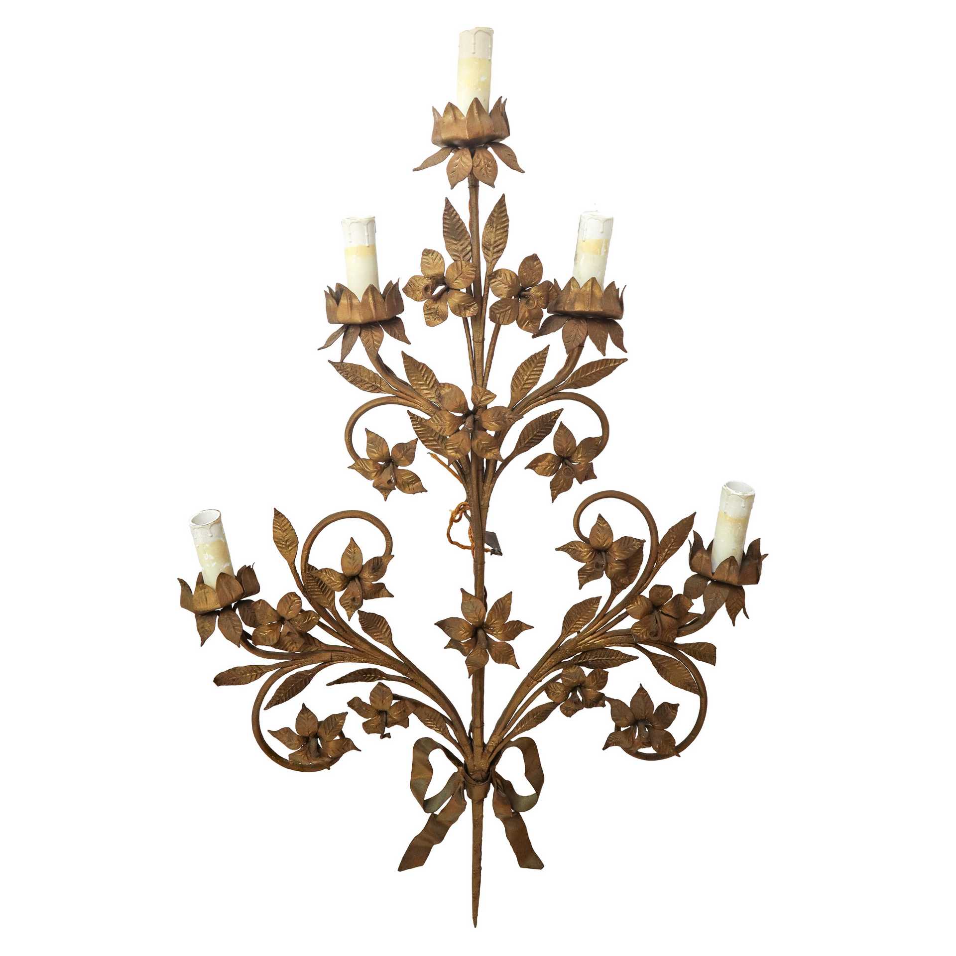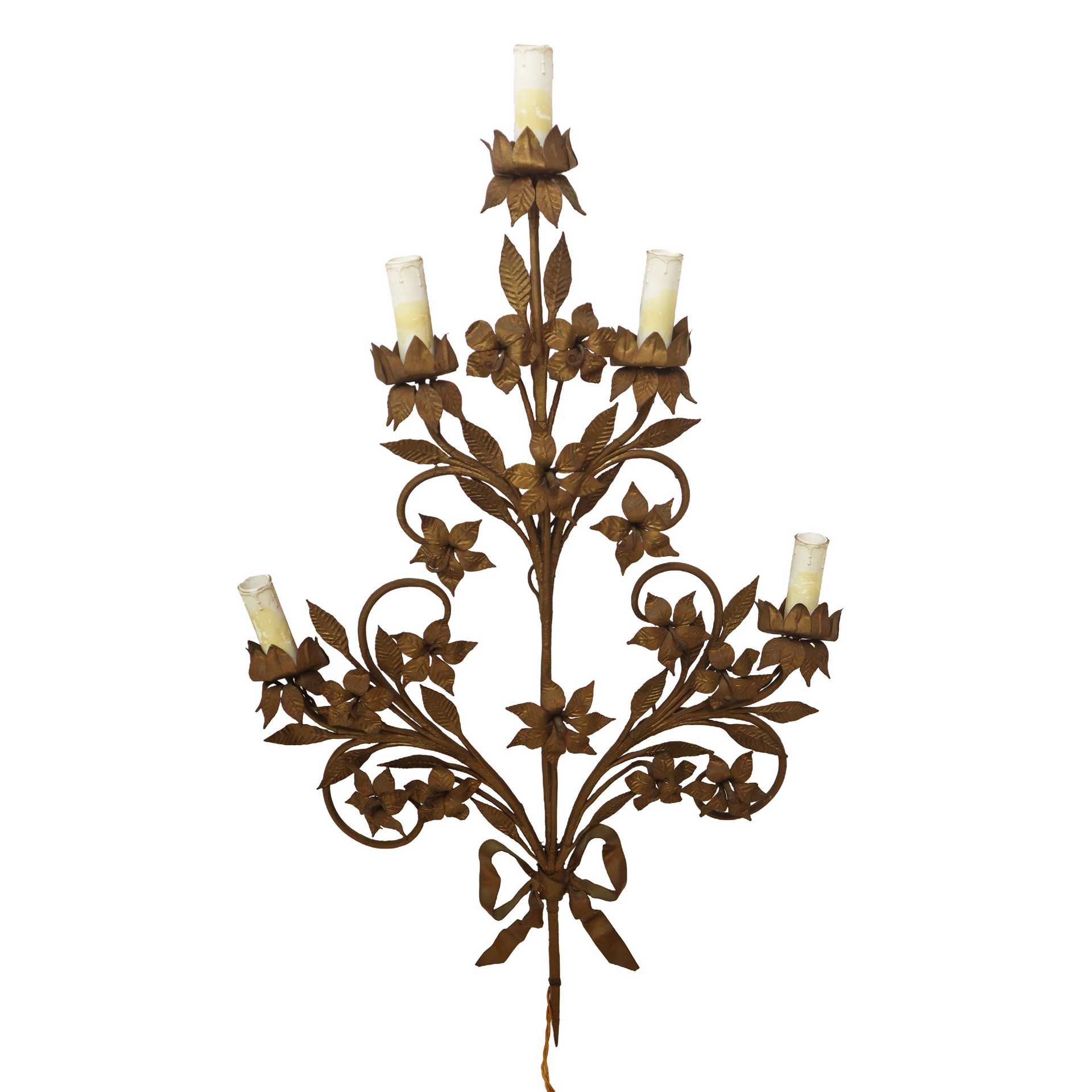 Coppia di appliques a 5 luci in metallo dorato lavorato a foglie e fiori H cm 85x48