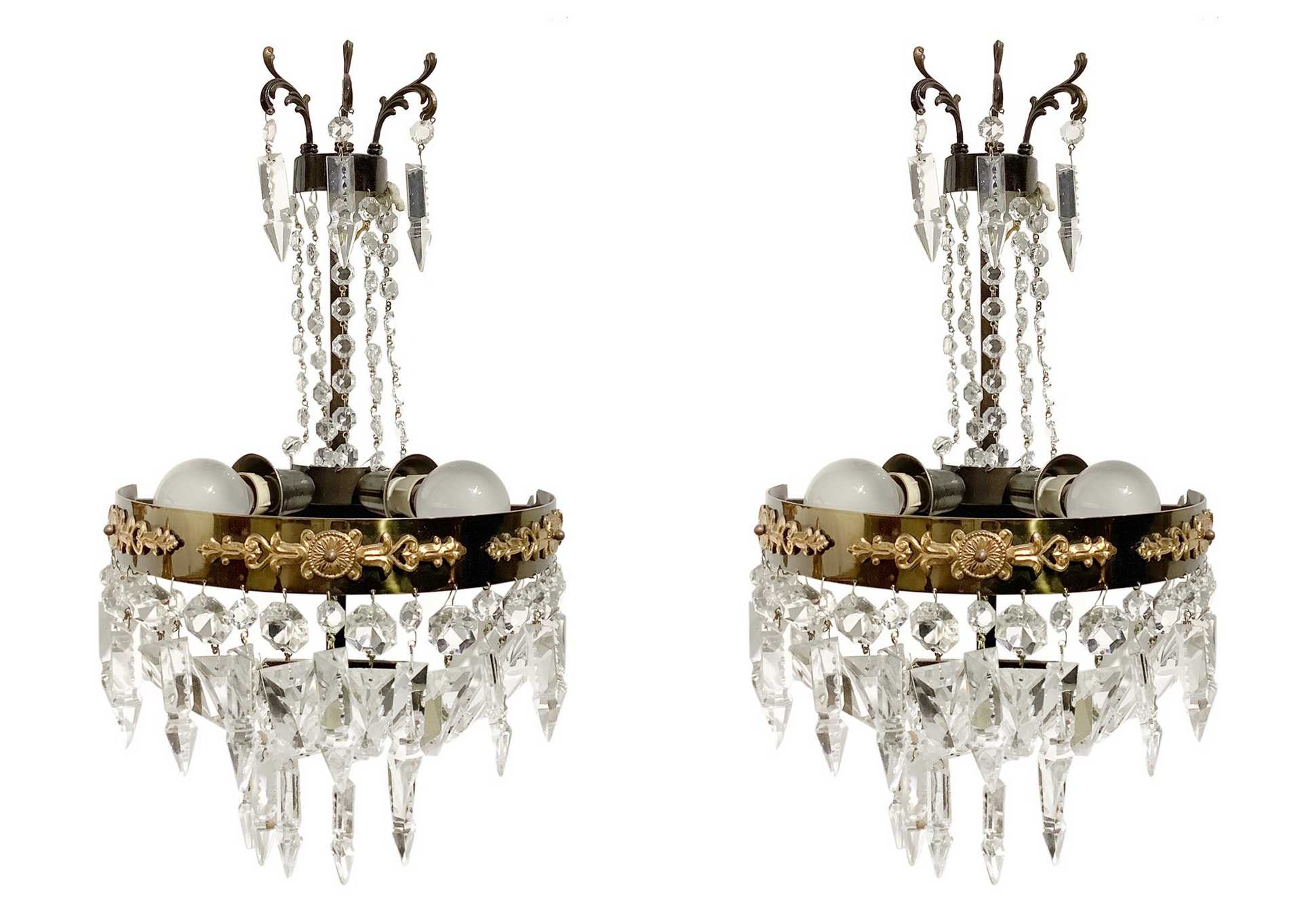Coppia di appliques in metallo dorato e cristalli, 70's