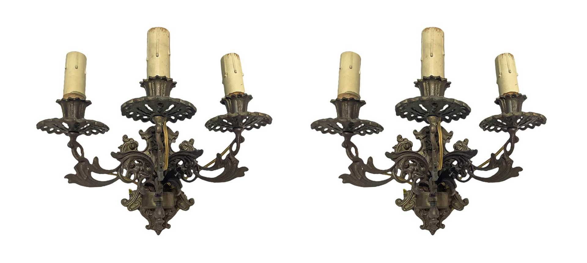 Coppia di appliques in bronzo dorato a tre luci
