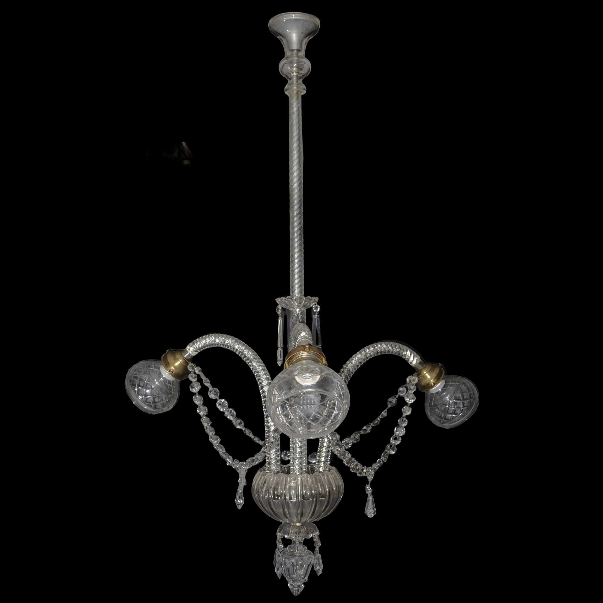 Lampadario a tre luci con stelo e bracci in vetro a torchion, Primi 20° secolo