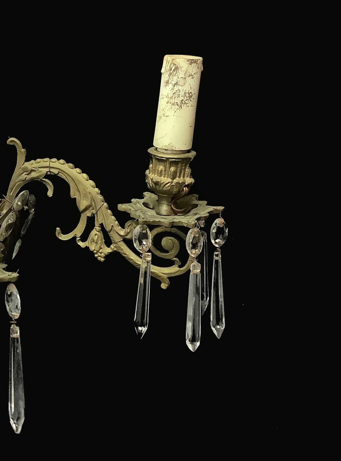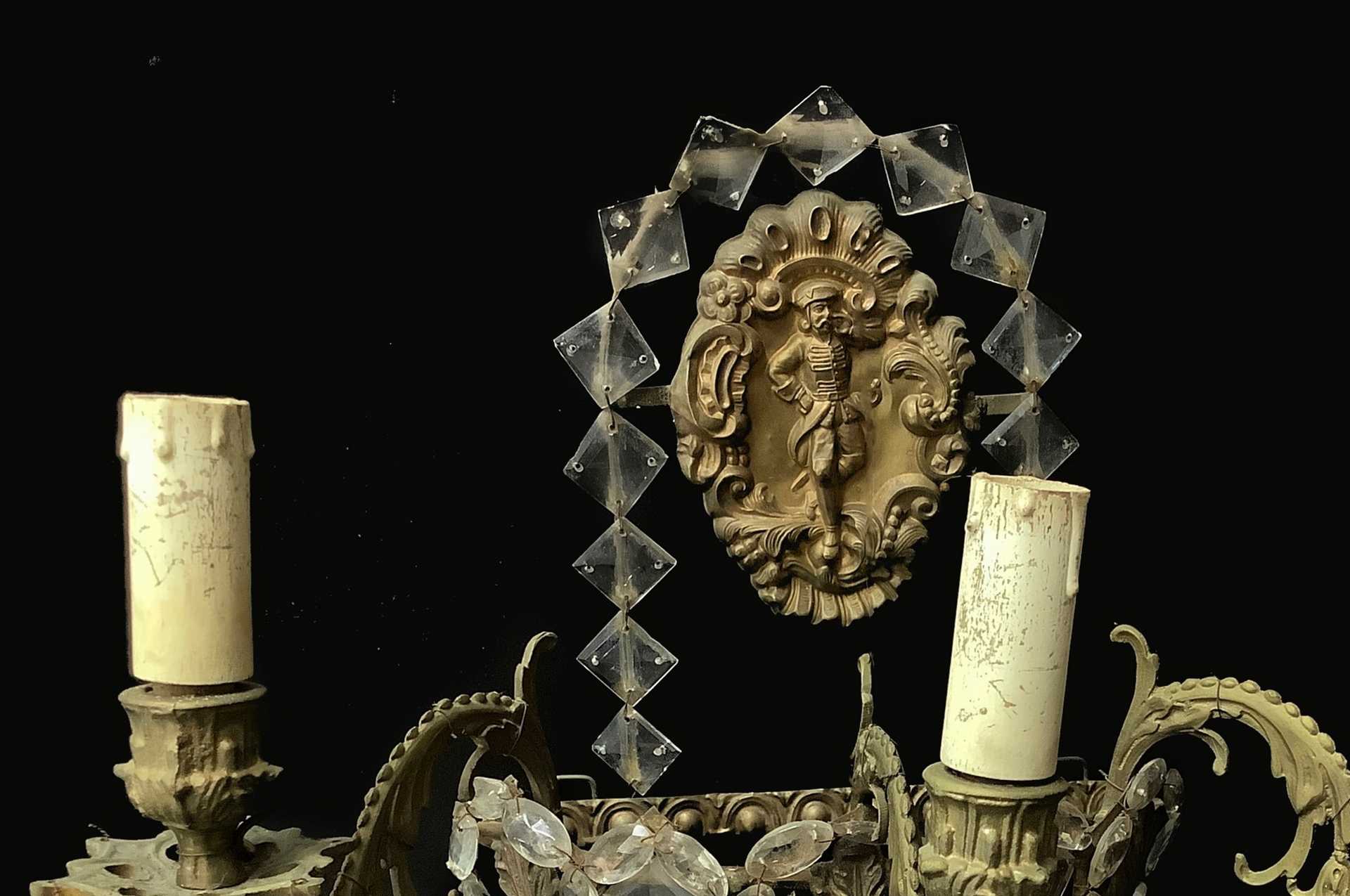 Coppia di appliques in ottone e carta di spagna leggera, con brindoli molati a mano. A tre luci, Late 18° secolo
