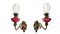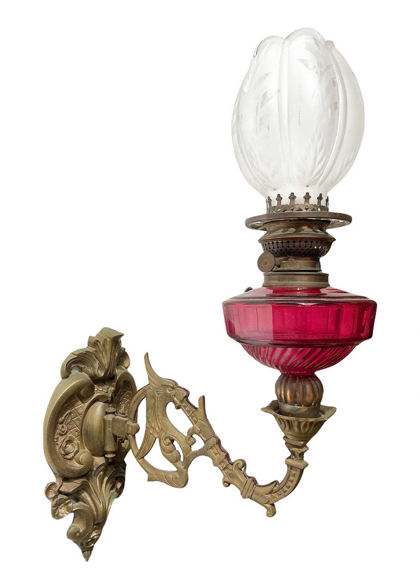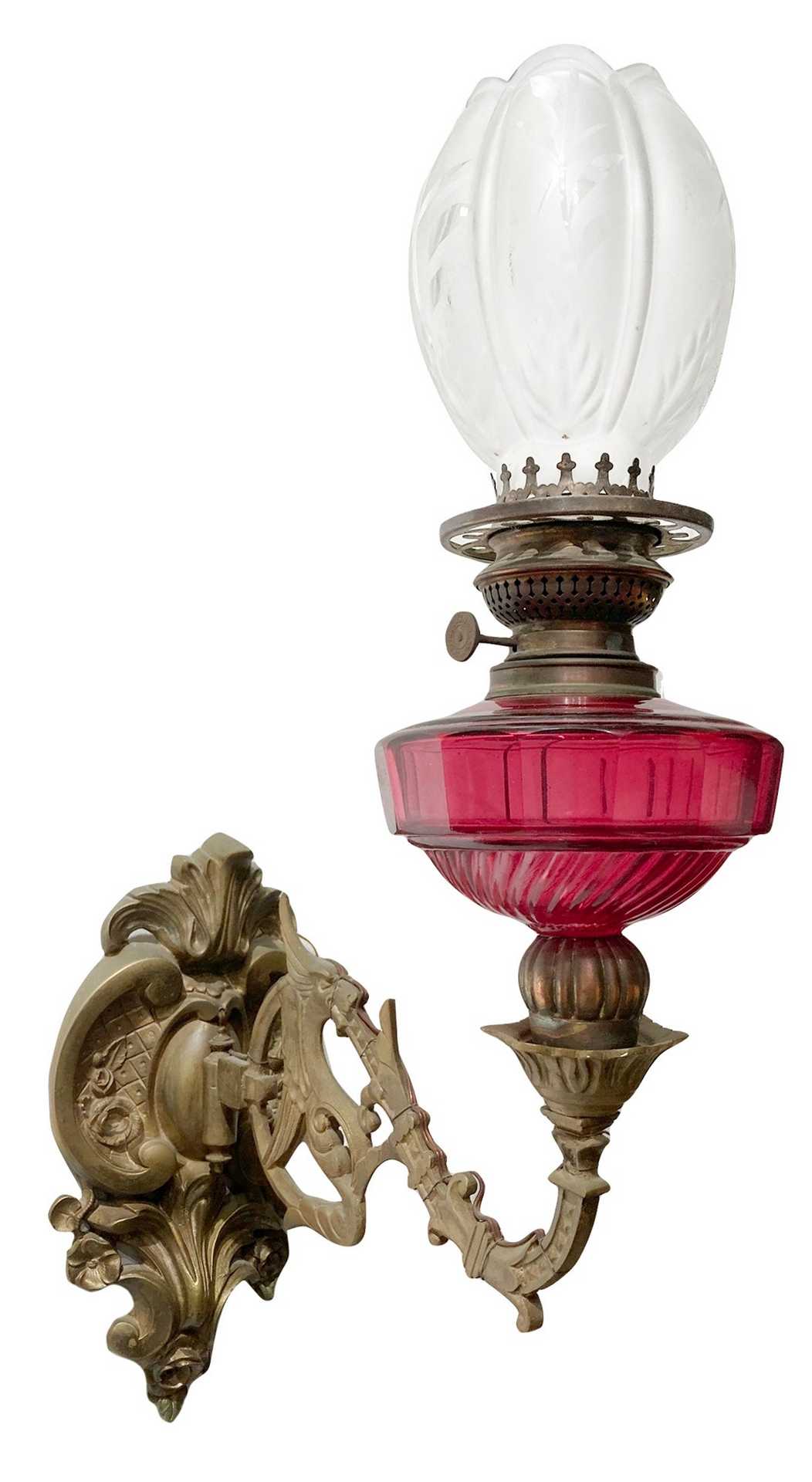 Coppia di appliques a petrolio in bronzo e vetro, Late 19° secolo h cm 46 x cm 34 Vetro di color magenta, presente minima filatura in una bocciaVetro di color magenta, presente minima filatura in una boccia