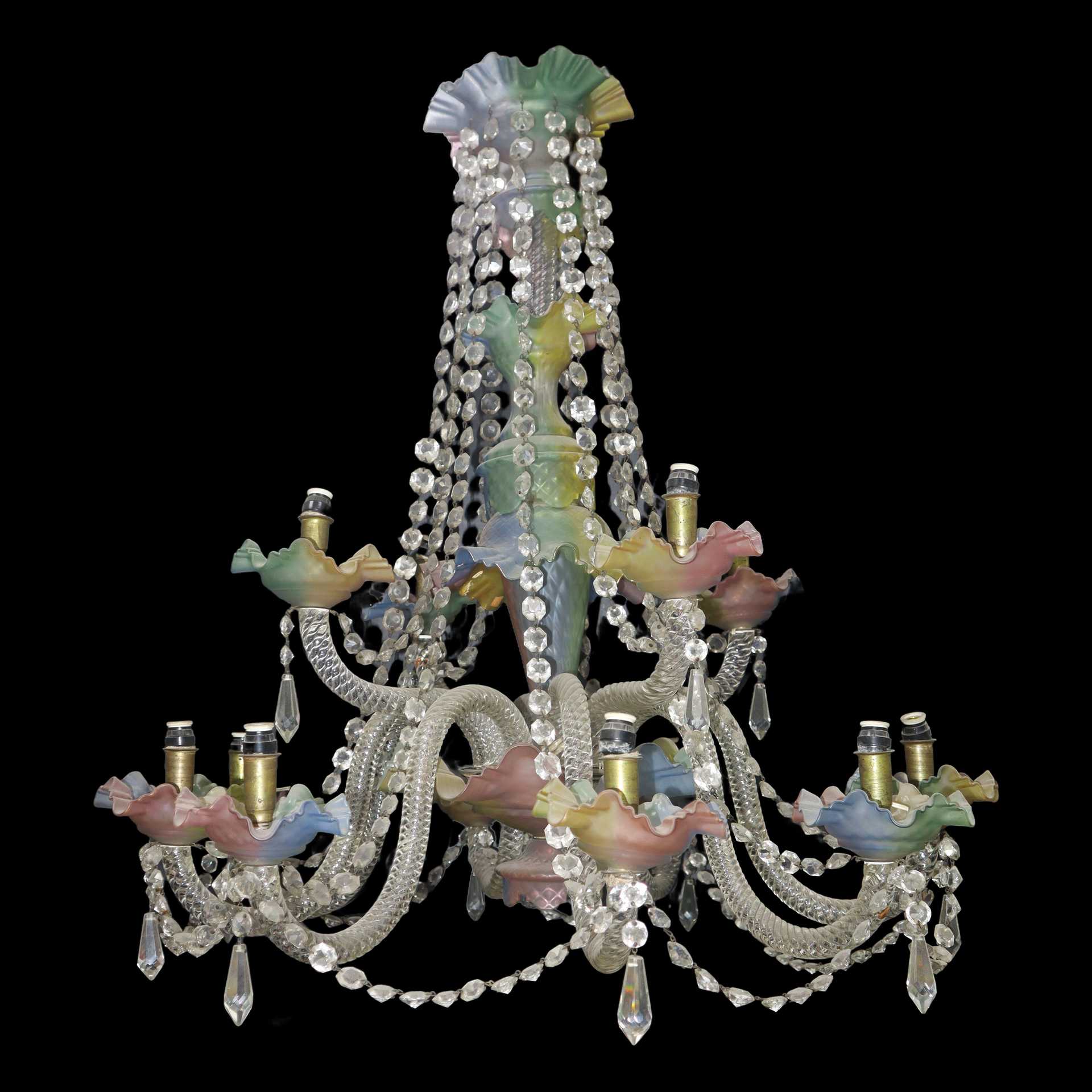 Elegante lampadario in cristallo Baccarat, 19° secolo h cm 80x90 Bracci a torcion in cristallo trasparente, piattini in vetro colorato e brindoli a rosette, a 12 luci.Bracci a torcion in cristallo trasparente, piattini in vetro colorato e brindoli a rosette, a 12 luci.