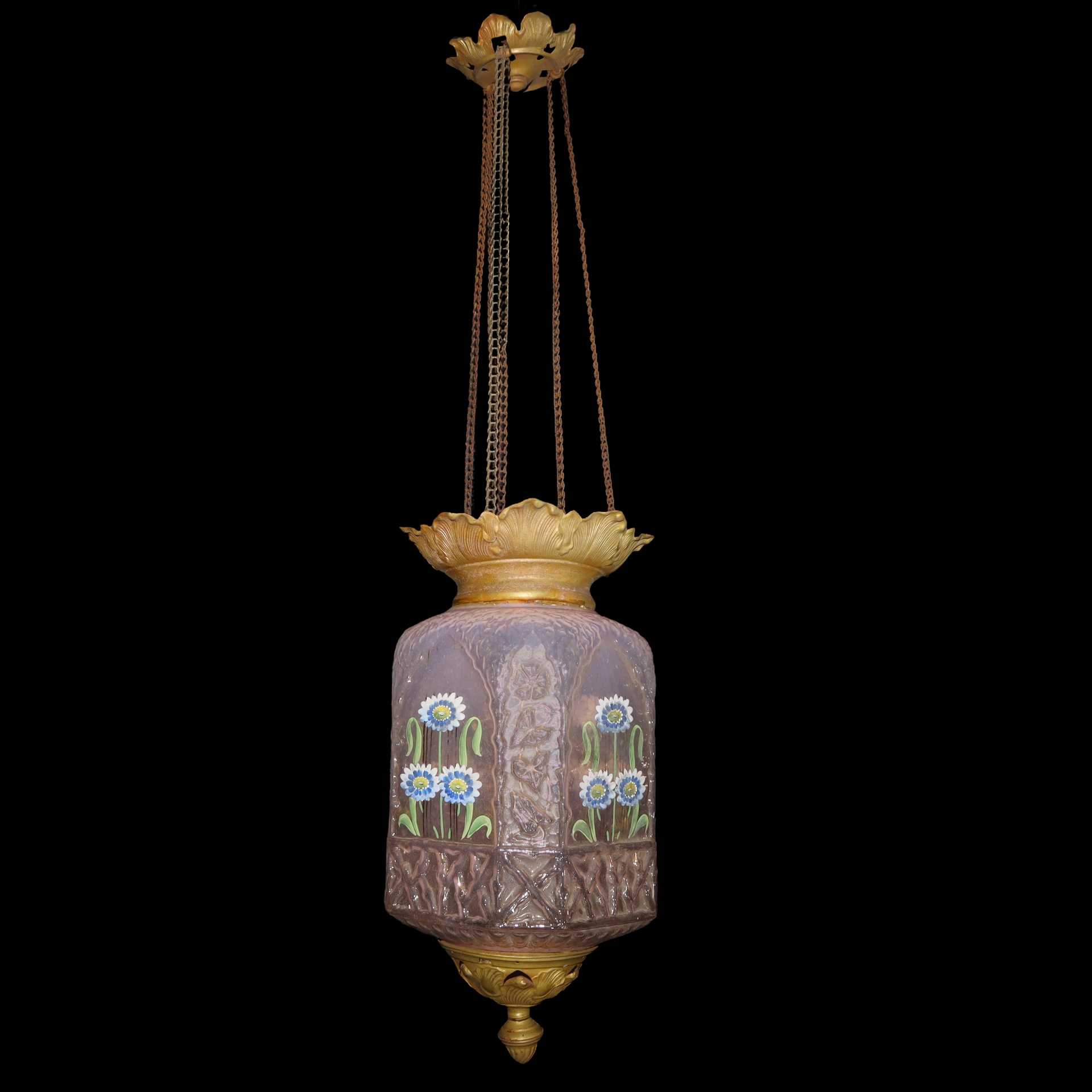 Sospensione in vetro di Murano rosa con smalti floreali dipinti a mano, Primi 20° secolo