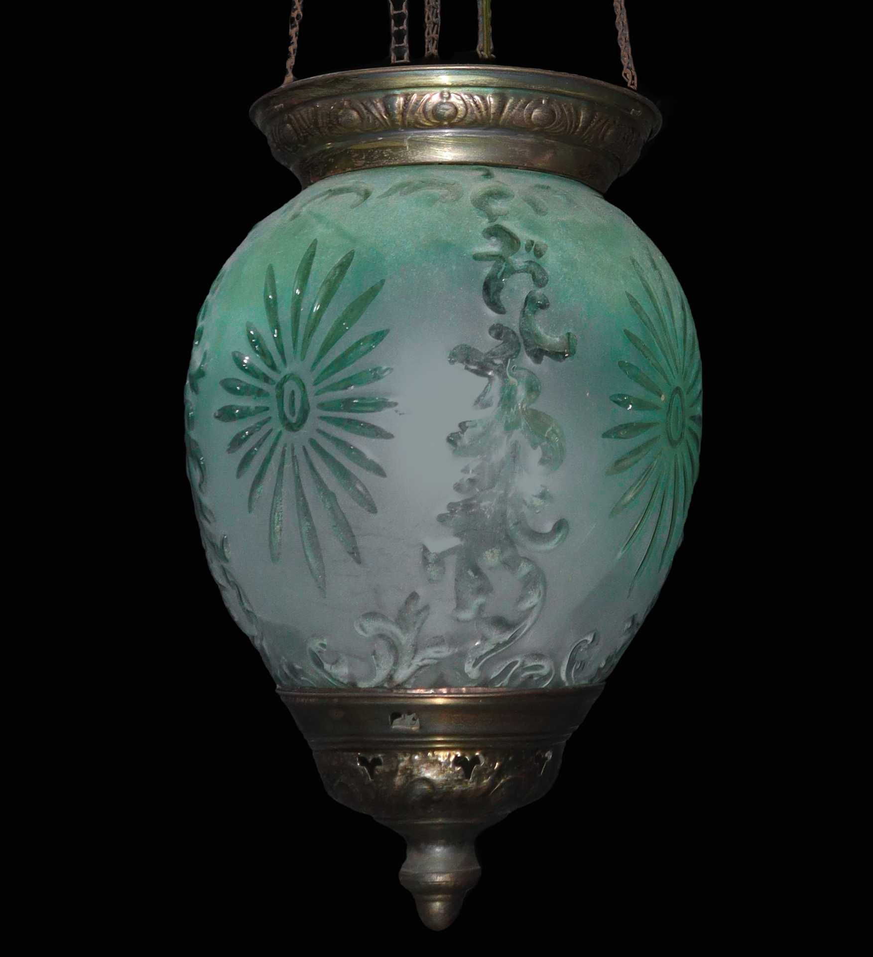 Lampada a sospensione in vetro verde di Murano soffiato a mano.