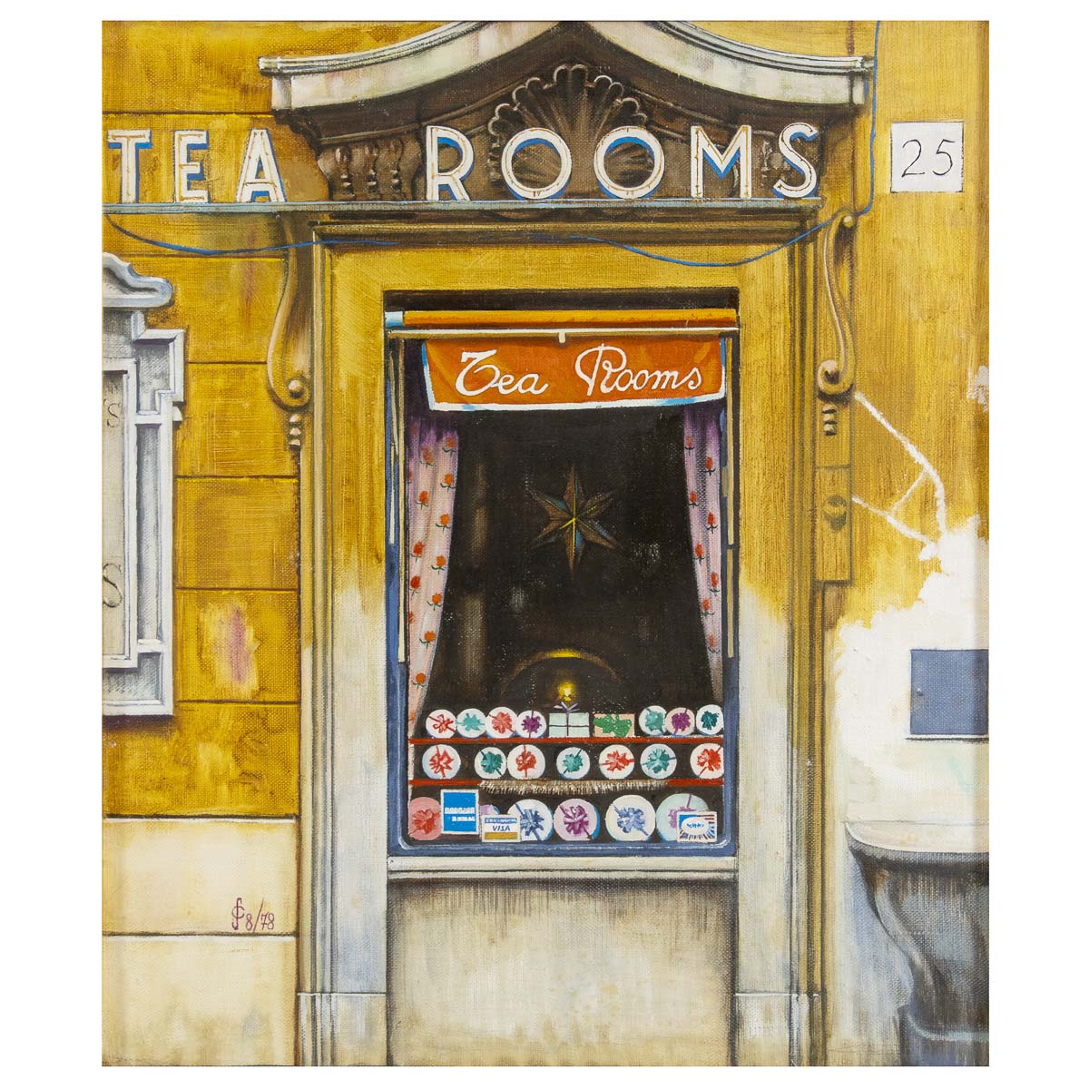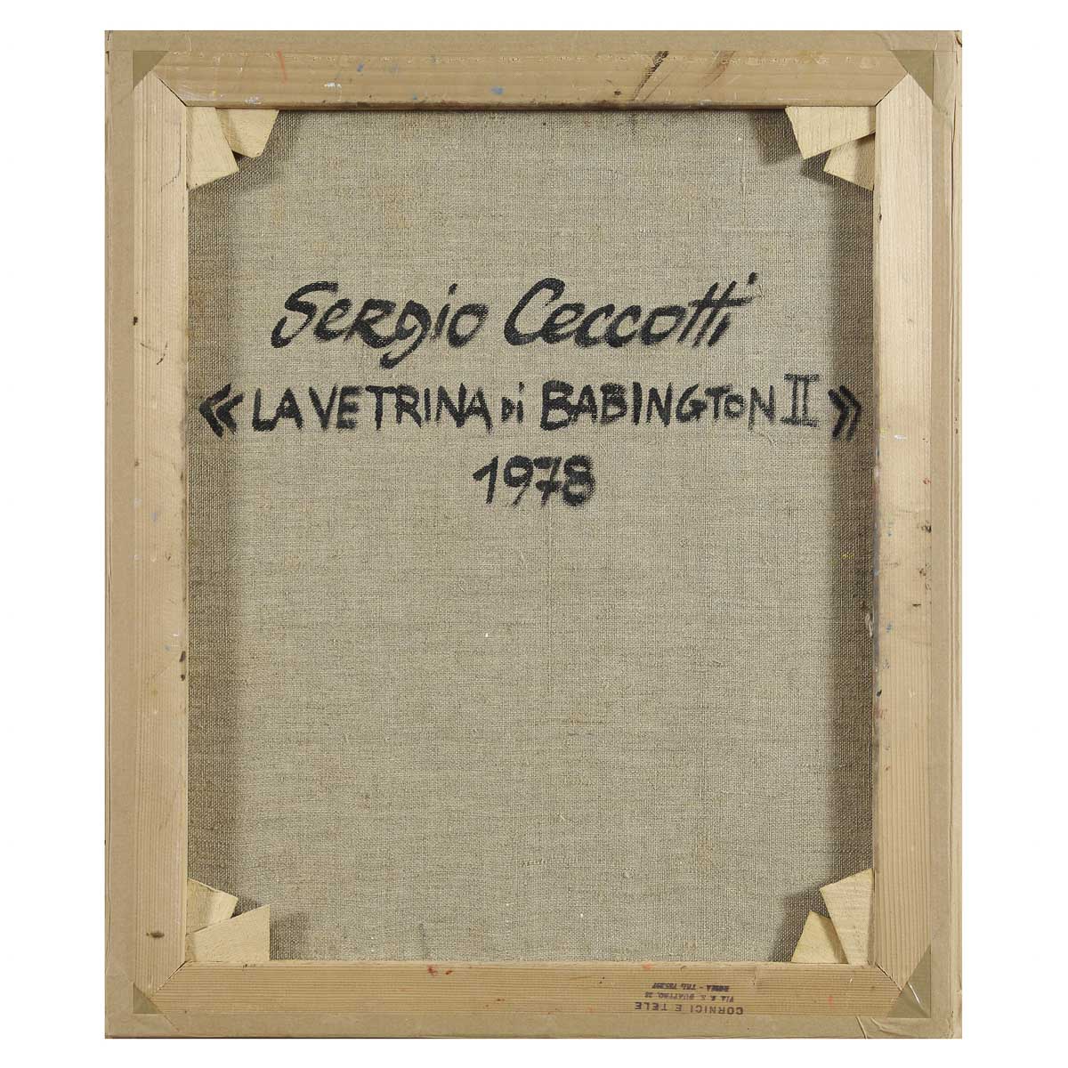 "La vetrina di Babingtons II", 1978, olio su tela, siglato e datato in basso a sinistra, firmato, datato e titolato sul retro, entro cornice