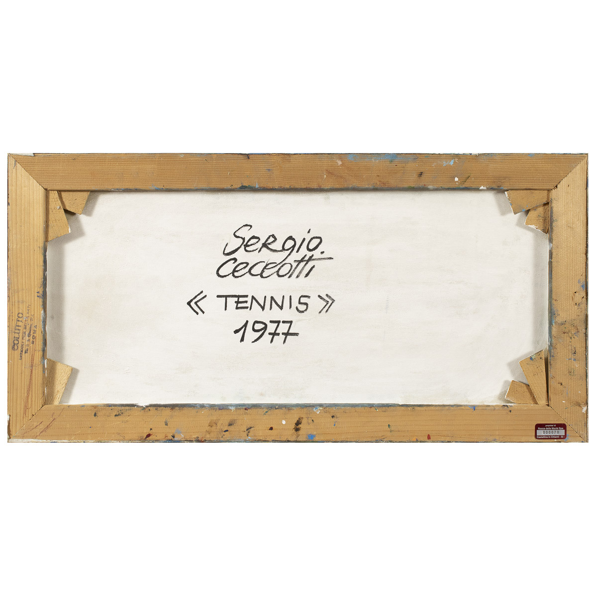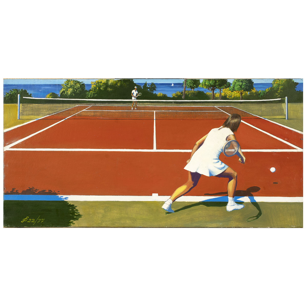 "Tennis", 1977, olio su tela, siglato in basso a sinistra, firmato, datato e titolato sul retro