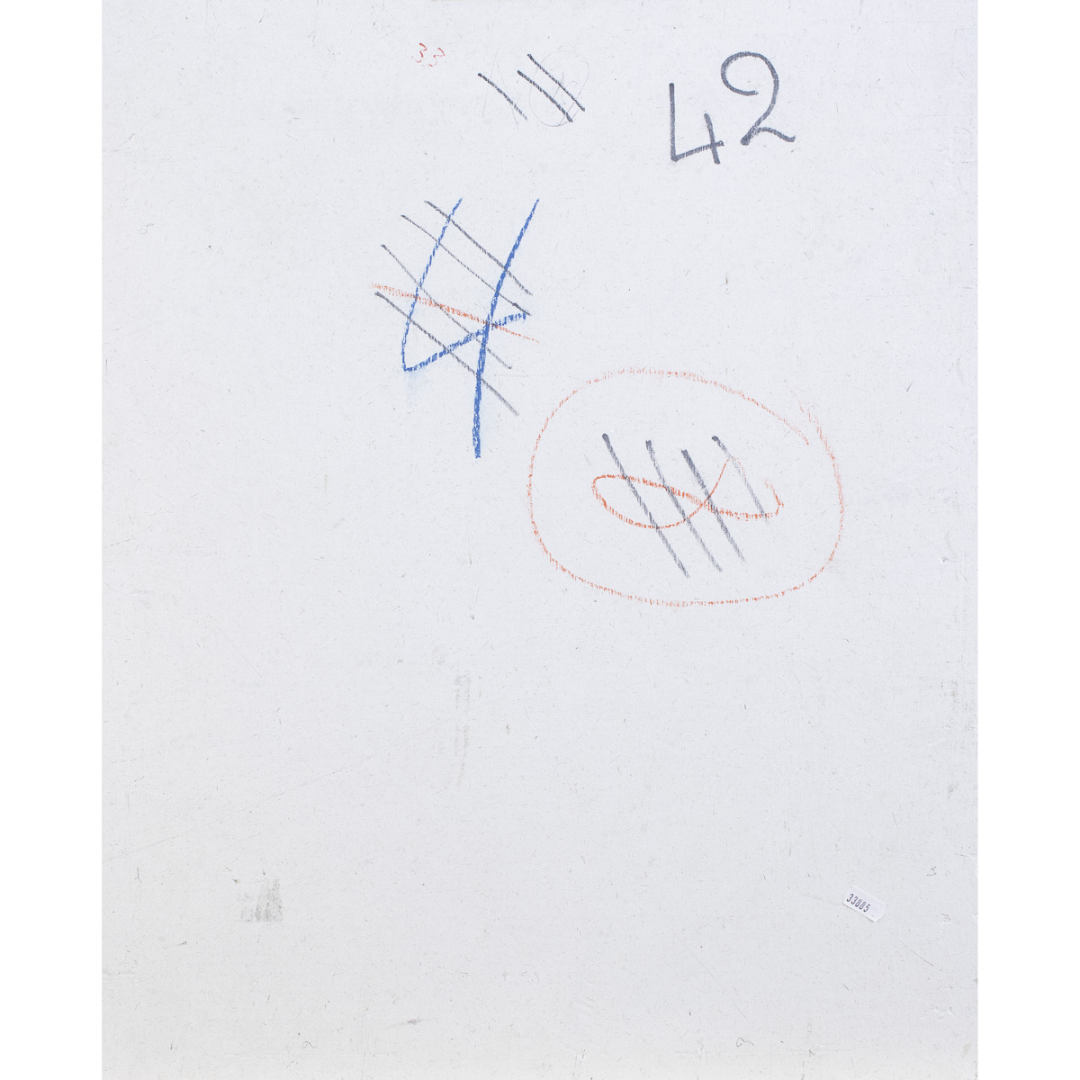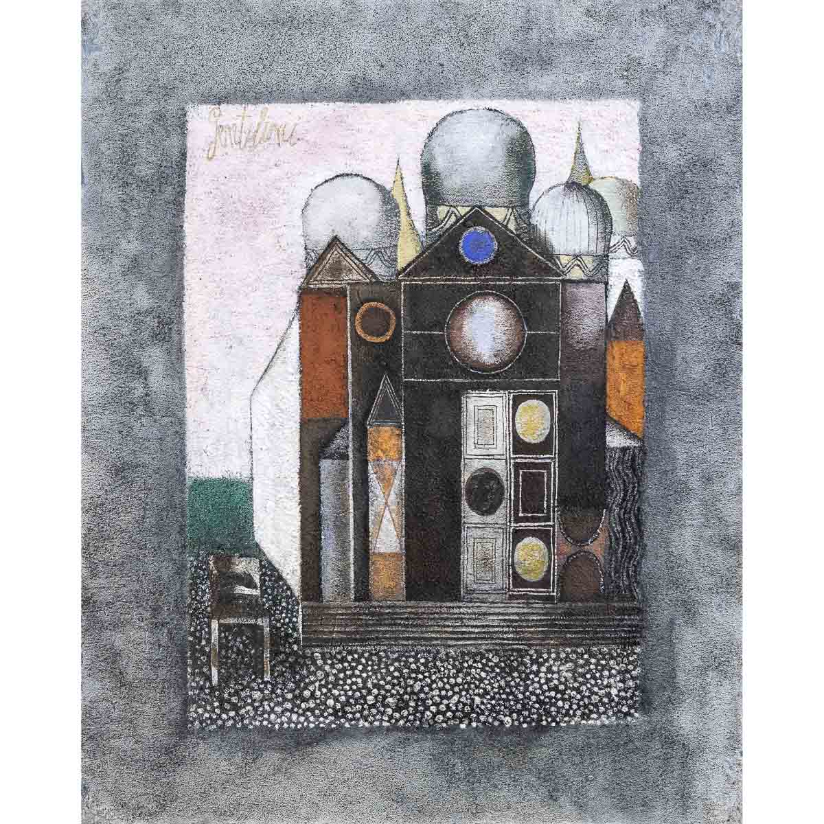 "Cattedrale per la Raffaello", 1965, olio su cartone sabbiato applicato su tavola, firmato in alto a sinistra, entro cornice