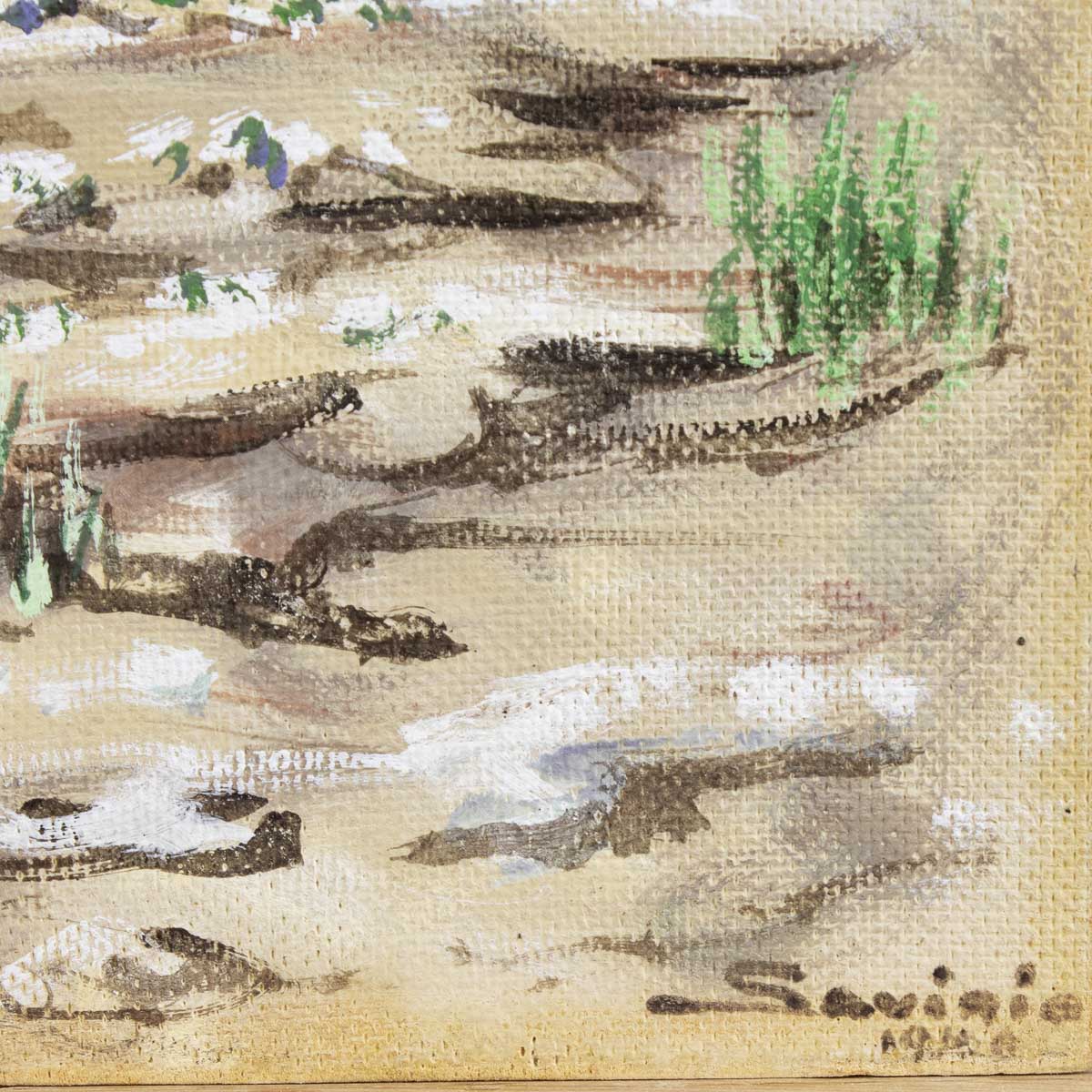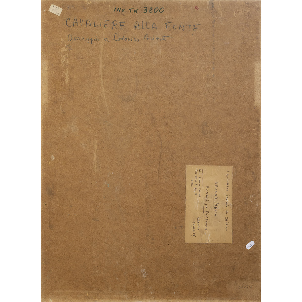 "Cavaliere alla fonte (omaggio ad Ariosto)", 1949, tempera su faesite, firmata e datata in basso a destra, titolata sul retro, entro cornice.