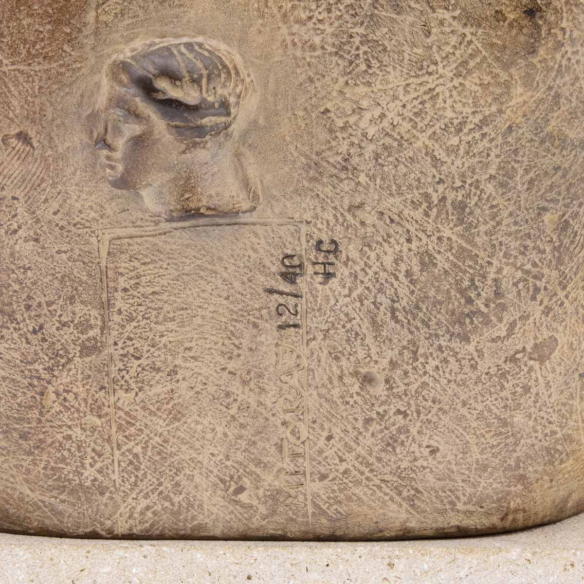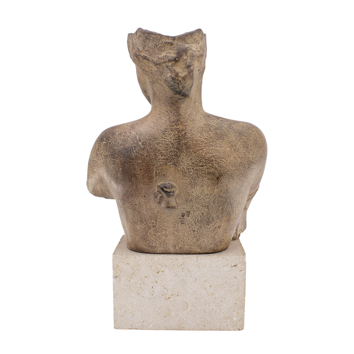 "Piccola greca", 1991, scultura in bronzo, 12/40, firmata sul retro, poggiante su base in pietra. Altezza complessiva 34 cm.