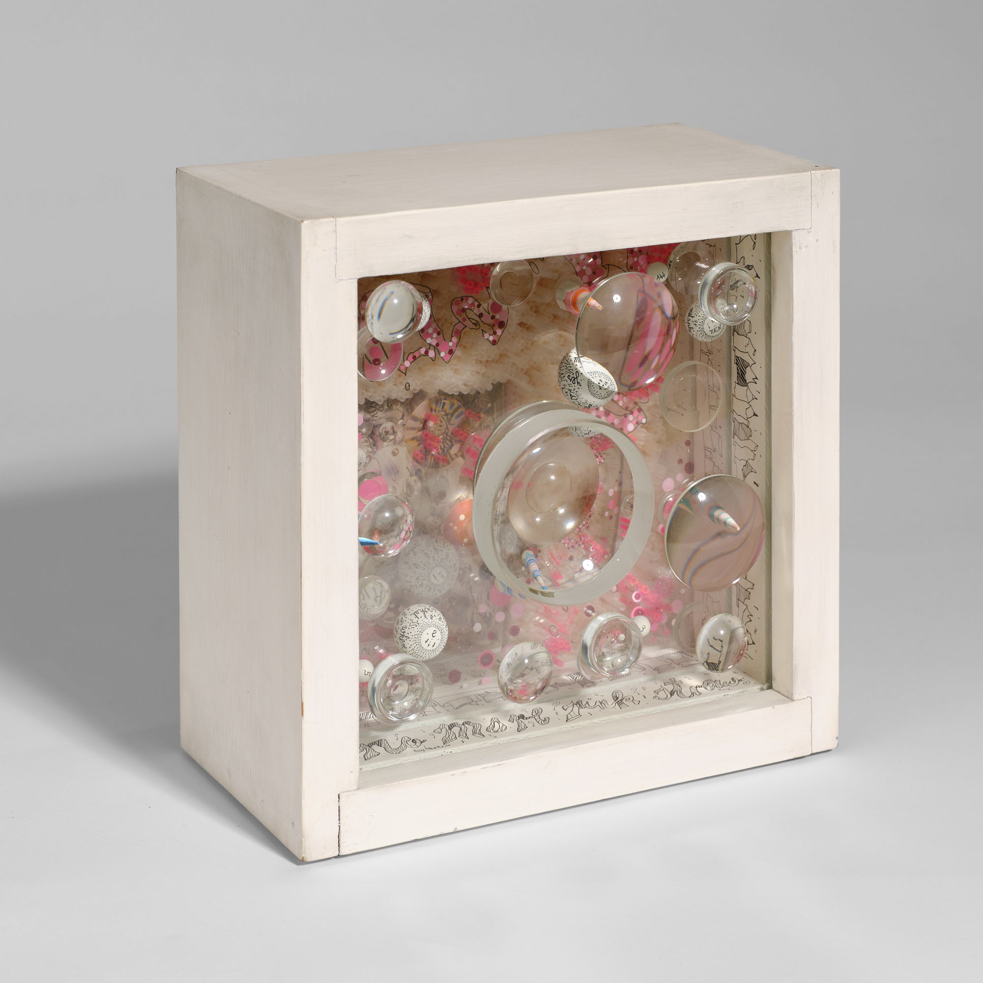 Assemblaggio, legno sagomato e dipinto, vetro, lenti ottiche, inchiostro, pittura e cannucce, cm. 28 x 27,5 x 15,2
