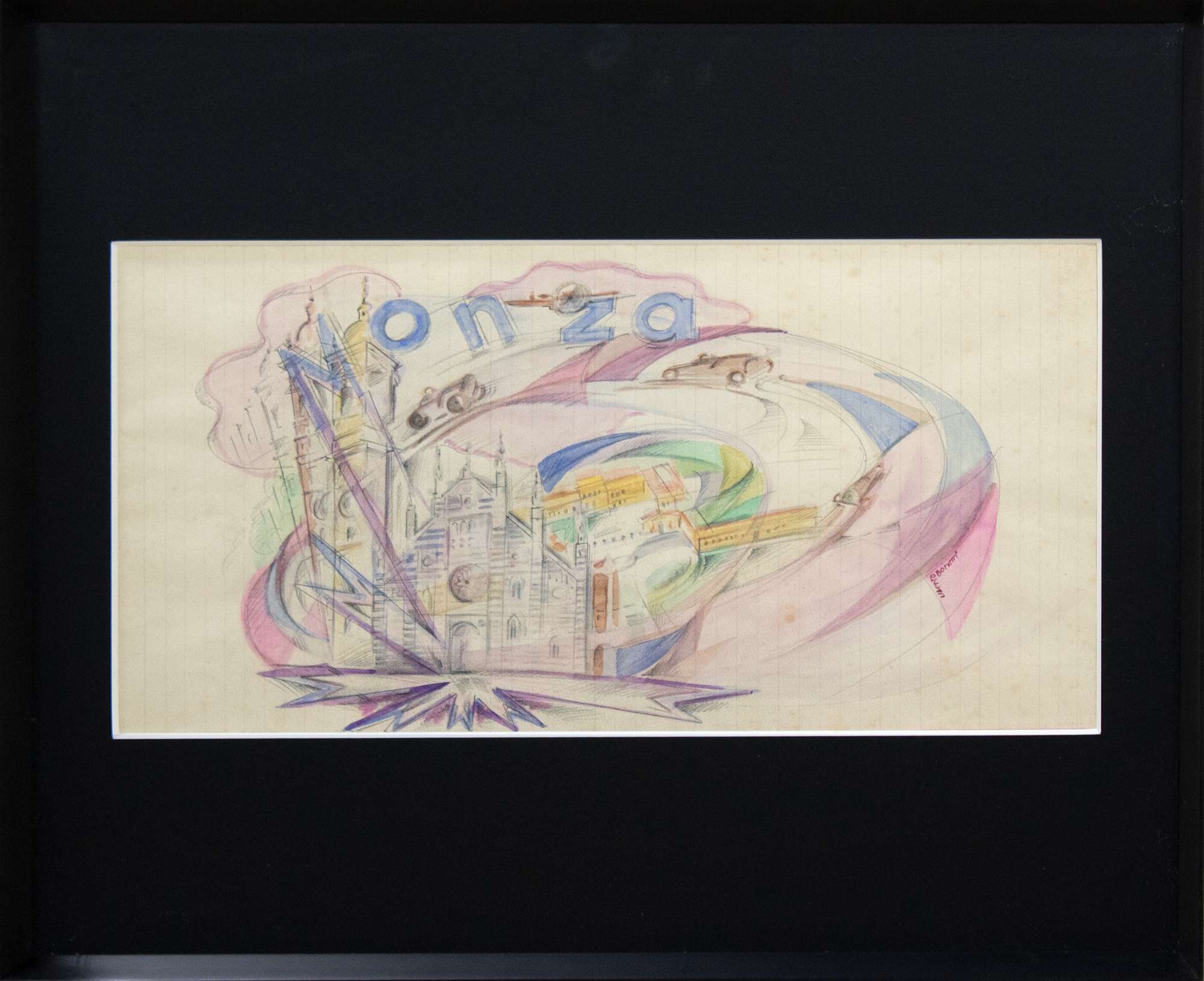 Uberto Bonetti, Monza, anni Trenta, tecnica mista su tela, 26x54 cm, pubblicazione num 214, pag 187, catalogo 'Anni 30. L'Italia nelle aeroviste di Uberto Bonetti' a cura di Adriana Bonetti