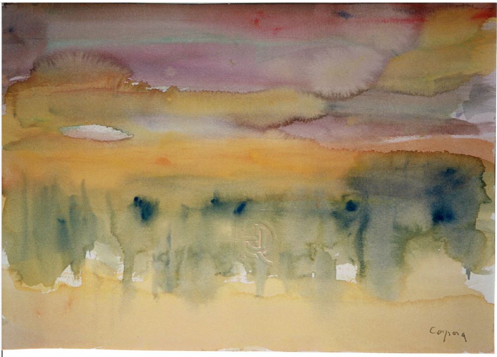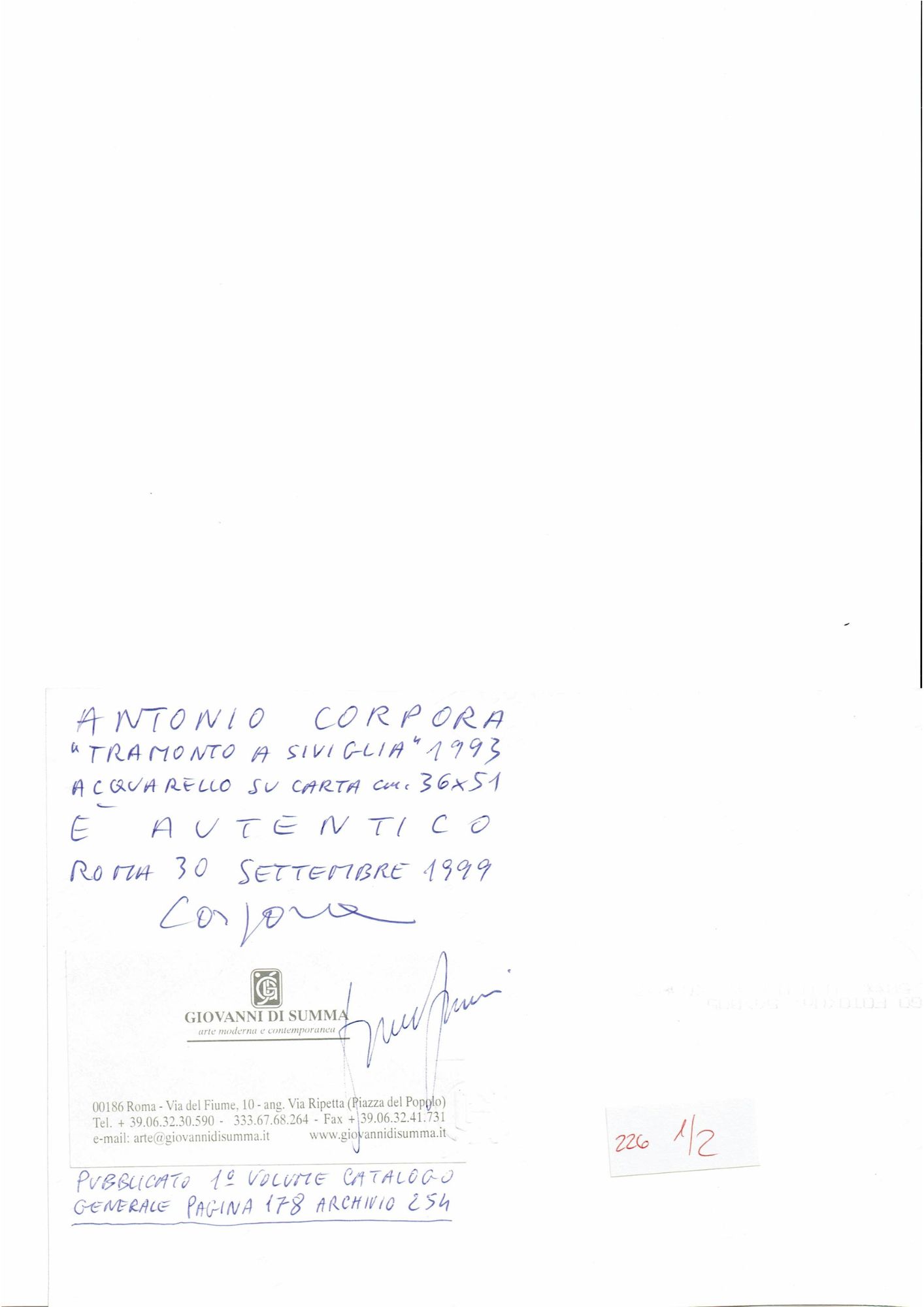 Antonio Corpora (Tunisi, 15 agosto 1909 – Roma, 6 settembre 2004), Tramonto a Siviglia, 1993. Cm. 36x51. Acquerello su carta, firmato in basso a destra. Opera accompagnata da autentica del Sig. Giovanni Di Summa, Arte Moderna e Contemporanea, Roma. Firma dell'artista. 30 settembre 1999. Bibliografia: Catalogo Generale 1 Vol. pp. 178, n. archivio 254.